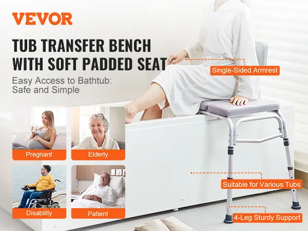 Het is eenvoudig te monteren met een gereedschapsloos montageproces. Pak de bank gewoon uit, zet hem op en hij is klaar voor gebruik. Het gebruiksvriendelijke ontwerp zorgt voor een snelle en probleemloze installatie. Deze bank bevat alle benodigde componenten voor montage. Duidelijke instructies maken het proces eenvoudig. Gereedschapsloze montage bespaart tijd en moeite. Deze functie is ideaal voor ouderen en gehandicapten die mogelijk hulp nodig hebben. Geniet van een probleemloos en comfortabeler bad zonder de moeite van een ingewikkelde montageprocedure. De VEVOR badtransferbank biedt gemak en gebruiksgemak.