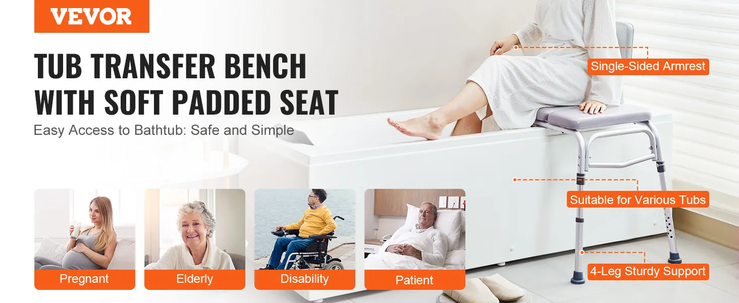 De VEVOR bad transfer bank is een must-have voor veilig en comfortabel baden. Het biedt stabiele ondersteuning bij het in- en uitstappen van het bad. Dit maakt uw badkamerervaring veiliger en comfortabeler. De bank is ideaal voor ouderen, gehandicapten of personen die een operatie hebben ondergaan. U kunt het risico op vallen en verwondingen verminderen. Onze bad transfer bank heeft een draaibare basis en antislip voetkussentjes voor extra stabiliteit. Ze zijn lichtgewicht, zodat u ze gemakkelijk kunt verplaatsen en aanpassen. De banken ondersteunen tot 500 lbs, wat duurzaamheid en betrouwbaarheid garandeert.