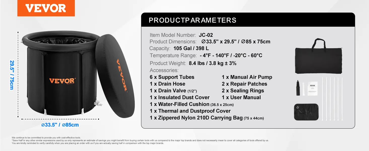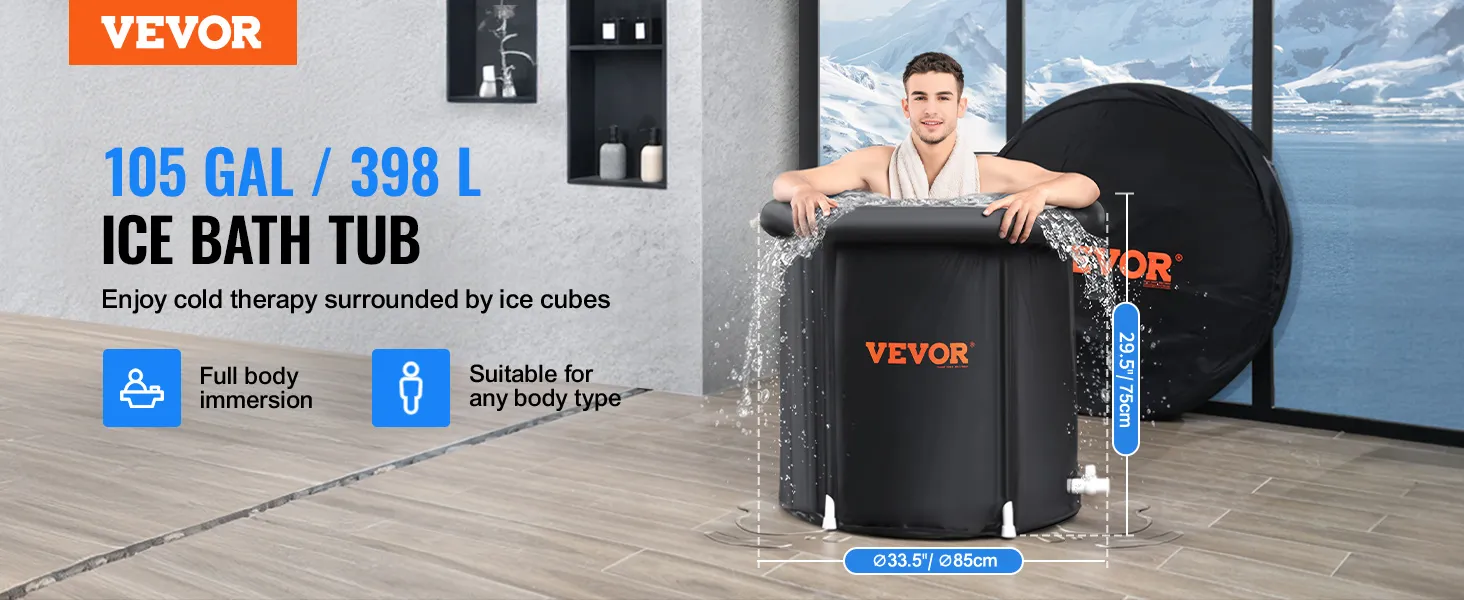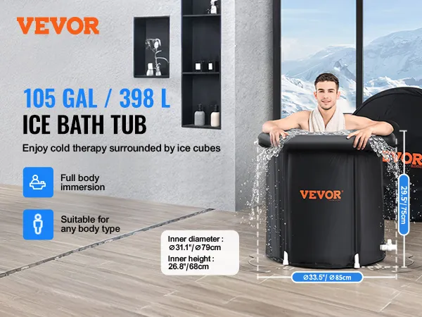 33.5" Large Ice Bath Tub: Our portable cold plunge tub is designed to accommodate most body types, allowing you to sit upright. With dimensions of 33.5"x29.5" / 850x750 mm and a capacity of 105 Gal / 398 L, it is recommended for people under 6.9' / 2.1 m in height. Experience the spaciousness and luxury of an ice water lake and pool anytime.