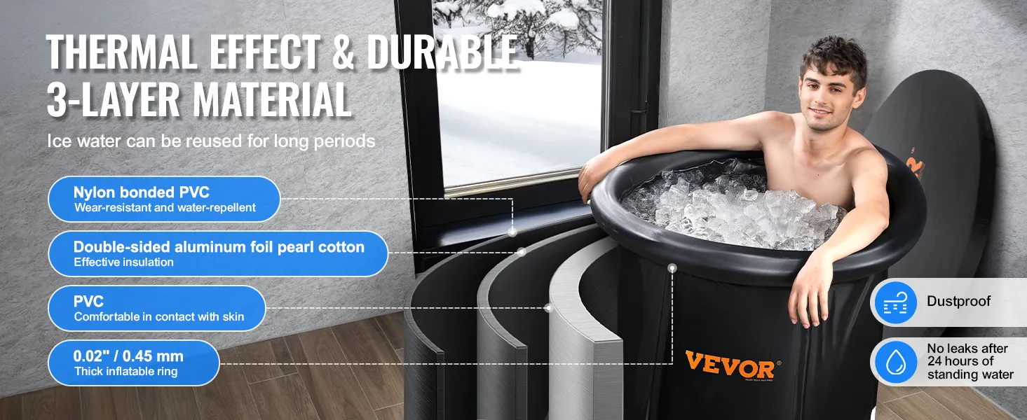 Durable & Thermal Multi-Layer Design: The body and lid of the ice bath tub are waterproof, and tear-resistant, featuring a multi-layer fabric with a PVC inner layer, double-sided aluminum foil pearl cotton middle layer, and water-repellent nylon bonded PVC outer layer. Both the tub body and the dust cover with pearl cotton layer provide excellent thermal effect. The usable water temperature range is -4°F-140°F / -20°C-60°C. The tub is stabilized by support tubes with a diameter of 0.8" / 20 mm.