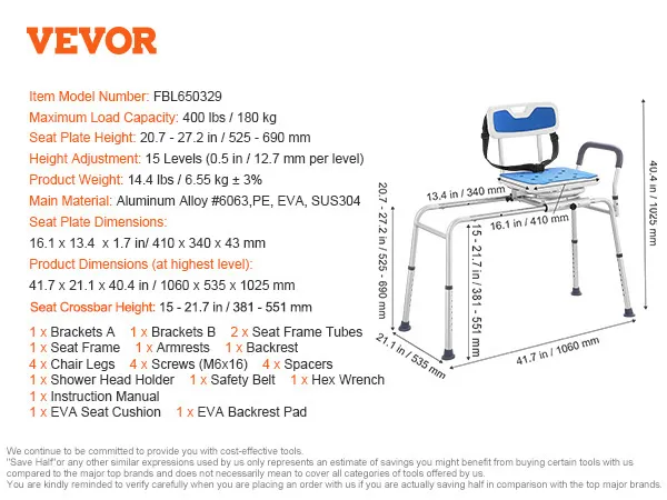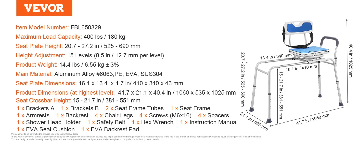 Onze schuifbad transferbank is geschikt voor gebruikers van verschillende groottes en behoeften. Dit betekent dat het geschikt is voor mensen van verschillende groottes en vereisten. Onze schuifbad transferbank is 41,7 x 21,1 x 40,4 inch hoog. De bank meet 41,7 x 21,1 x 40,4 inch. Het lage niveau is 40,5 x 19,7 x 33,5 inch. Ons lichtgewicht ontwerp weegt slechts 14,4 lbs. U kunt ons platform eenvoudig verplaatsen en indien nodig aanpassen.