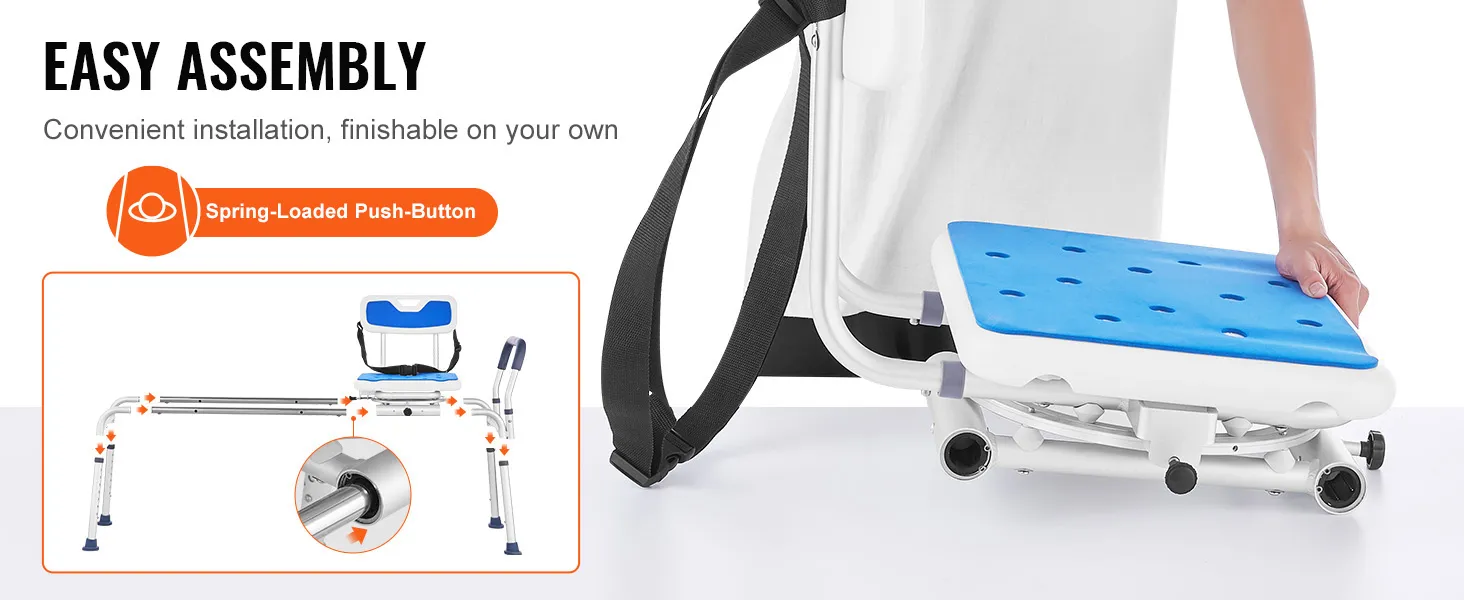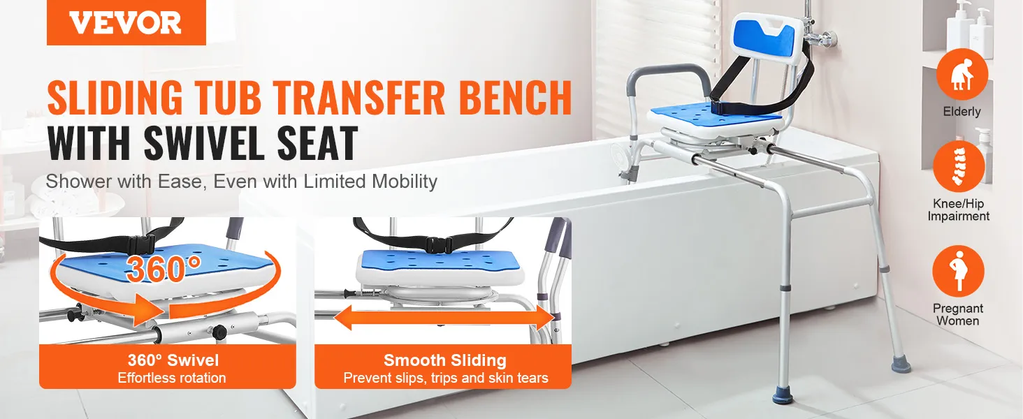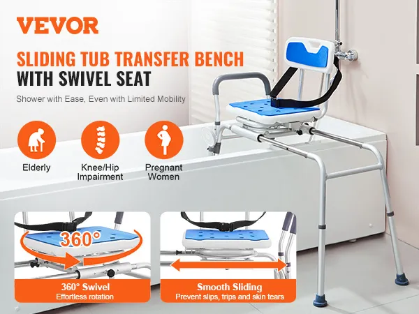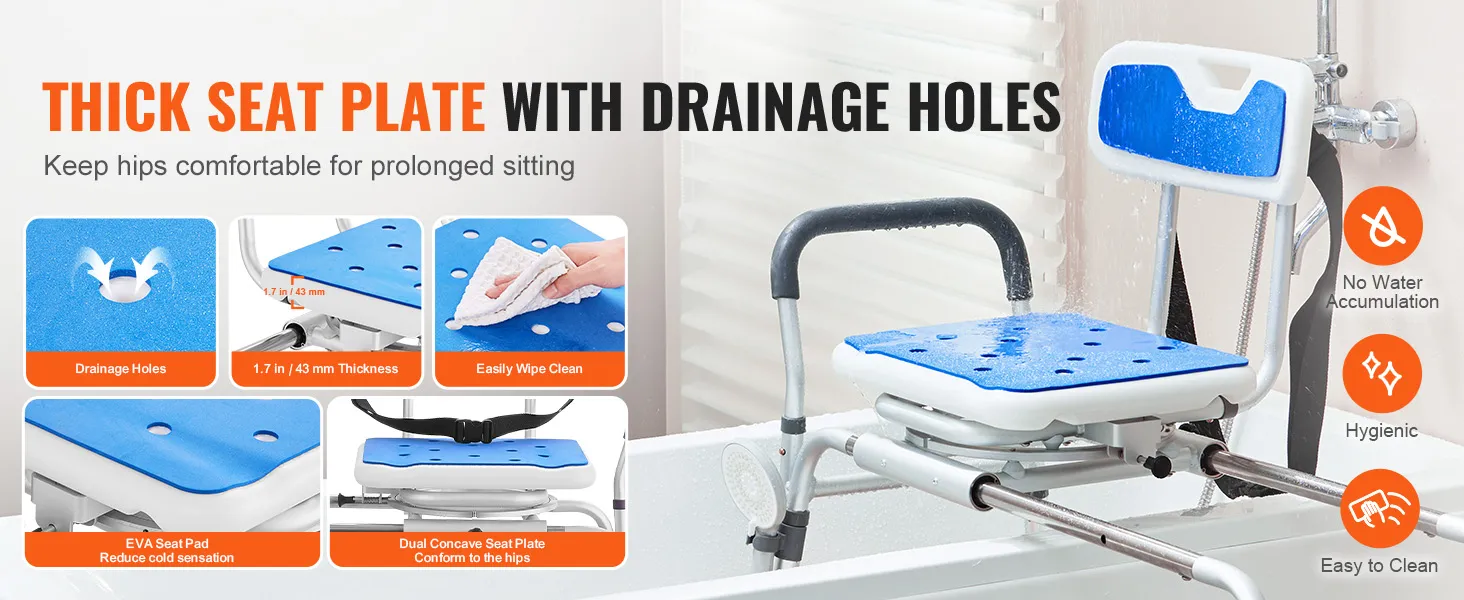 Het schuifmechanisme en de 360 graden draaibare zitting zorgen voor een soepele glijervaring. Deze functie zorgt ervoor dat gebruikers gemakkelijk kunnen draaien bij het in- of uitstappen van het bad. Onze functies zorgen voor eenvoudig draaien bij het in- of uitstappen van het bad. U raakt gewend aan douchen zonder te staan. Het is dus ideaal voor ouderen, gehandicapten of mensen die een operatie hebben ondergaan. De draaibare stoelen vergemakkelijken het in- en uitstappen. Ze verbeteren de veiligheid moeiteloos.