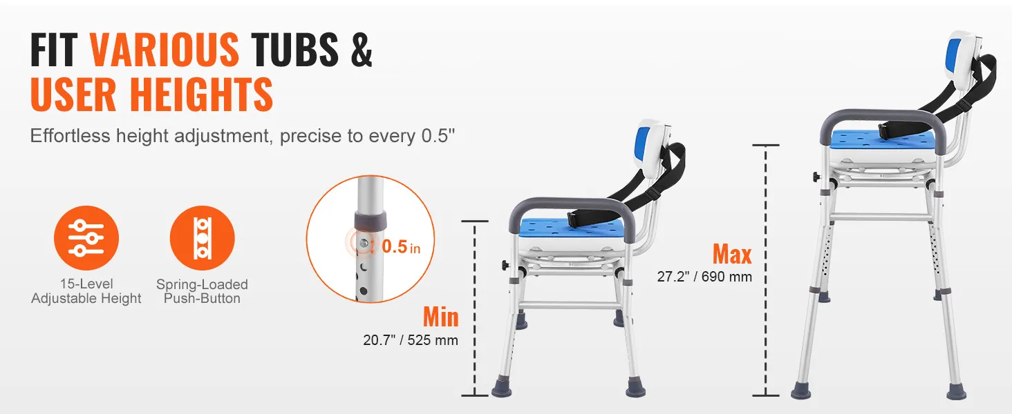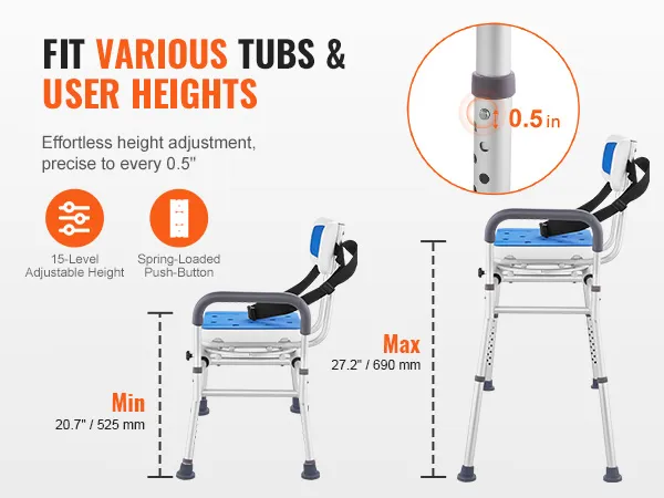 Onze schuifbad transferbank heeft 15 verschillende zithoogtes. Ze variëren van 20,7" tot 27,2". Gebruikers kunnen de bank aanpassen aan hun specifieke behoeften. De veerbelaste drukknoppen op elke poot zorgen voor snelle en veilige aanpassingen. Het is geschikt voor verschillende bad- en gebruikershoogtes. Deze functie biedt een gepersonaliseerde en comfortabele zitervaring voor alle gebruikers.