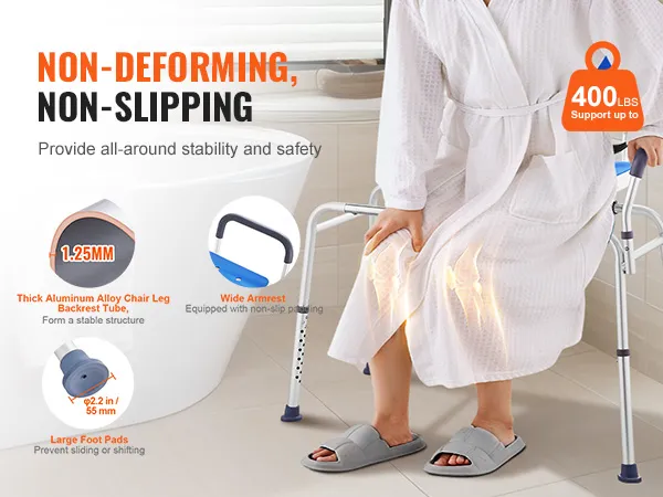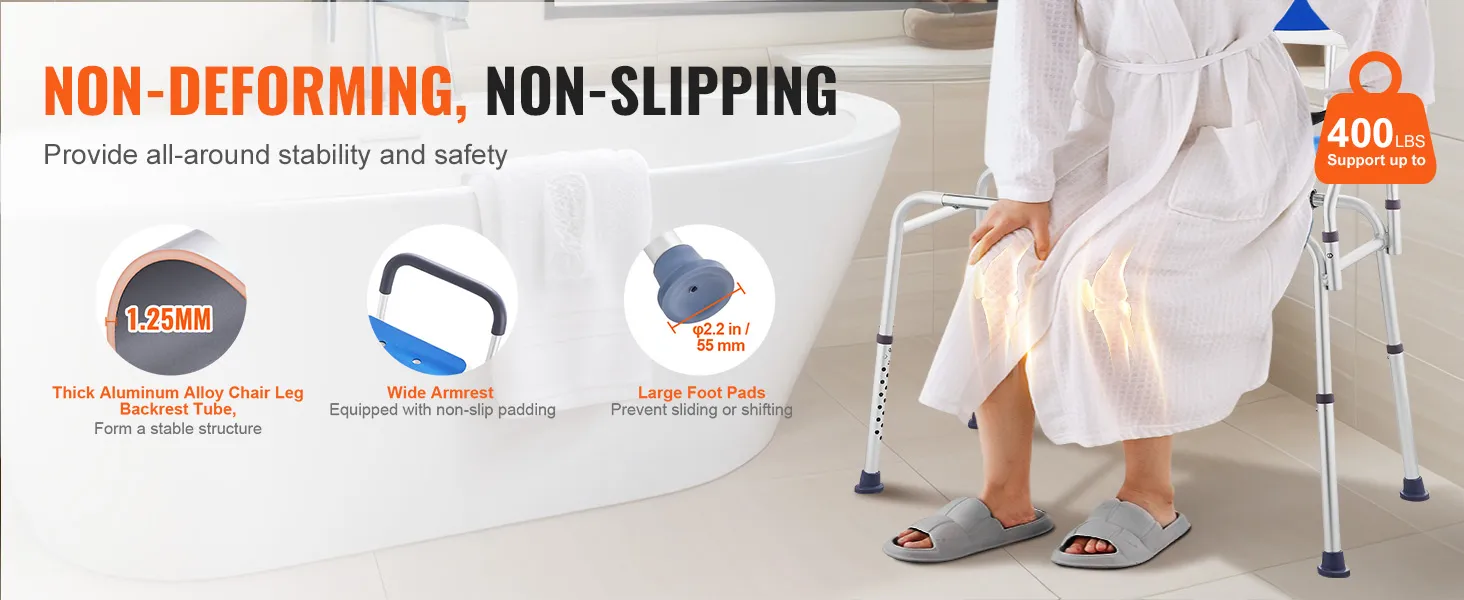 Het stevige 4-poots ontwerp, compleet met brede armen en antislip voetkussentjes, houdt de badstoel stevig en voorkomt schuiven of verschuiven. De zachte, antislip armleuningen maken het opstaan gemakkelijker en bieden een comfortabele en veilige grip. Dit ontwerp zorgt voor veiligheid en stabiliteit tijdens gebruik.