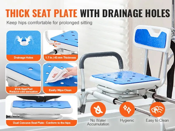Het is tijd om afscheid te nemen van koude, harde stoelen! Onze douchestoel met draaibare zitting heeft een comfortabele rugleuning en een 1,7" dikke zitplaat. Gemaakt van zacht HDPE-kunststof. De zitting biedt een gezellig en comfortabel gevoel. Dit verbetert de douche-ervaring. Er zijn meerdere afvoergaten die zorgen voor snel drogen en voorkomen dat er water ophoopt. Dus, het is gemakkelijk schoon te maken en te onderhouden na gebruik.