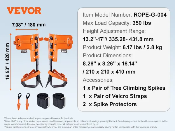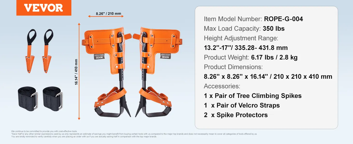VEVOR Tree Climbing Spikes, 1 Pair Alloy Steel Climbing Spurs, 350lbs Load Capacity Tree Climbing Gear with Straps and Spike Protectors, Arborist Equipment for Climbers, Hunting, Fruit Picking, Orange