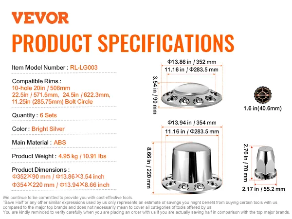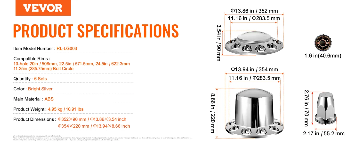 VEVOR Achteras Naafkappen Roestbestendige ABS Wielmoerkappen Bolvormige Askap voor Semi-Truck, Set van 6 met 2 Voor- en 4 Achteras Naafkappen Helder Zilver