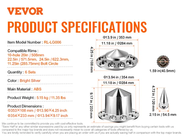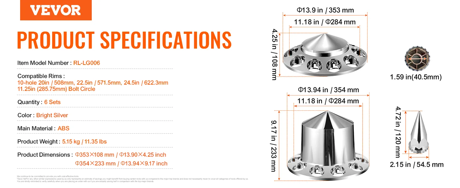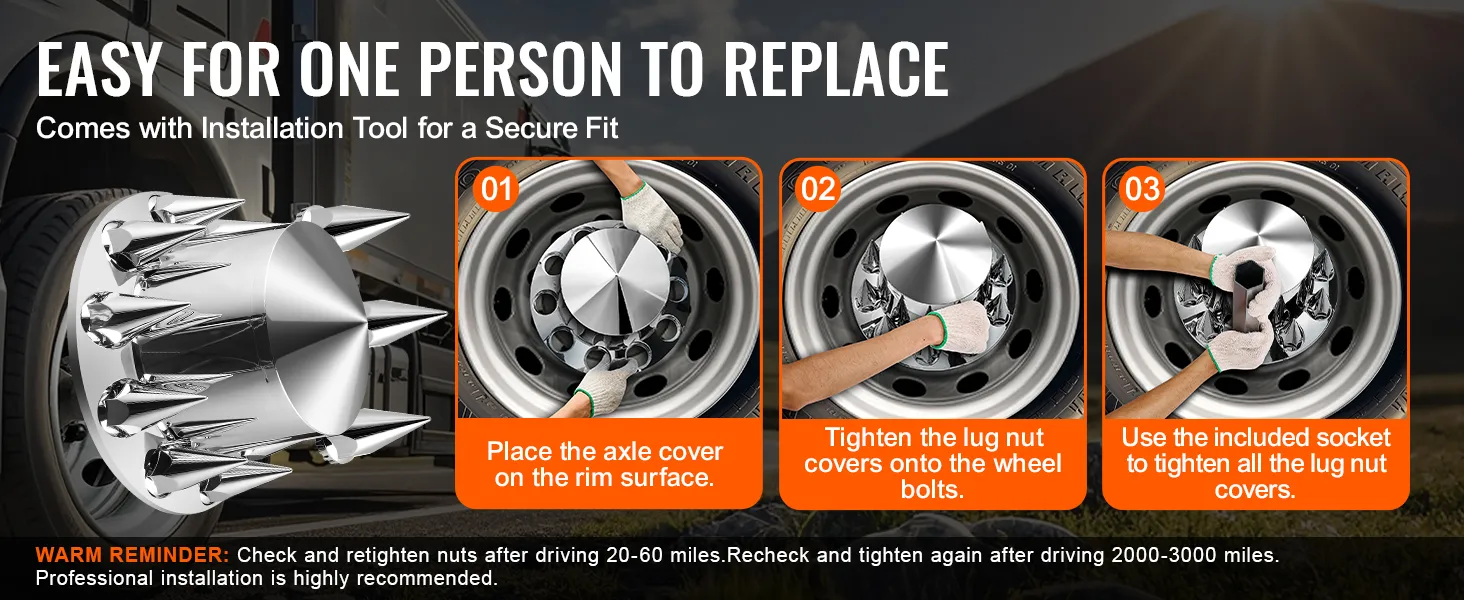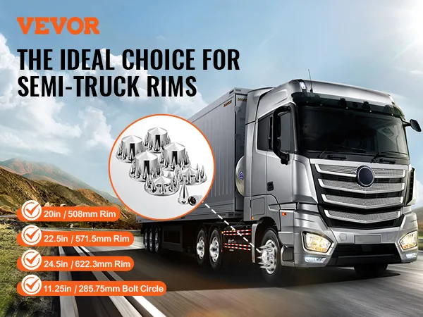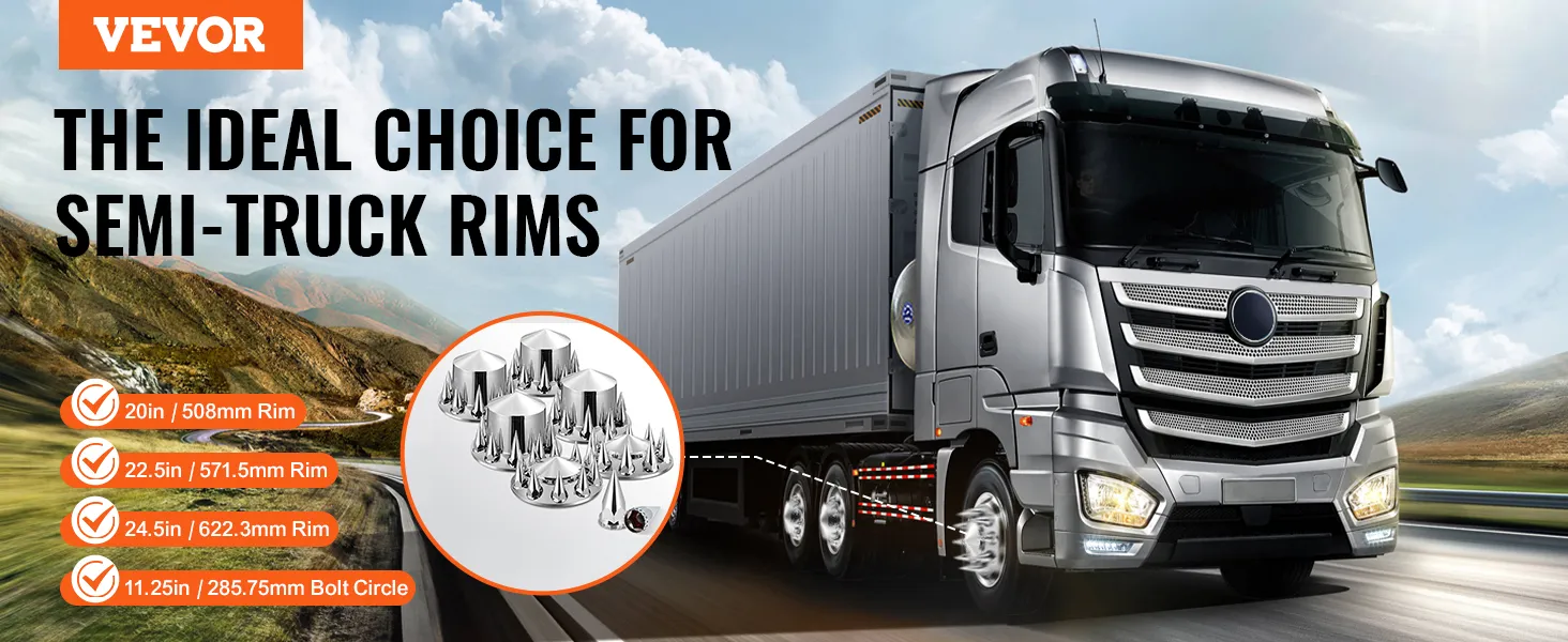 • Compatible with Multiple Rim Sizes: The complete axle cover combo kit fits various rim sizes, including 10-hole 20in, 22.5in, and 24.5in rims. This ensures easy installation regardless of your semi-truck model.
