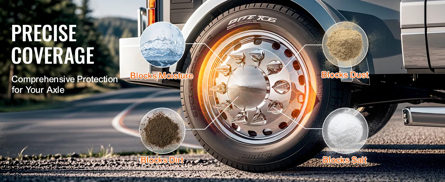 This complete axle cover combo kit provides full protection for your axle, effectively blocking moisture, dust, dirt, and salt to extend the lifespan of your axle and lug nuts. The precise coverage design shields the axle from corrosion and wear, enhancing safety.