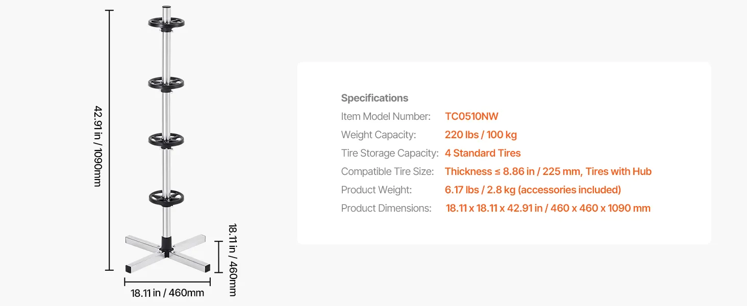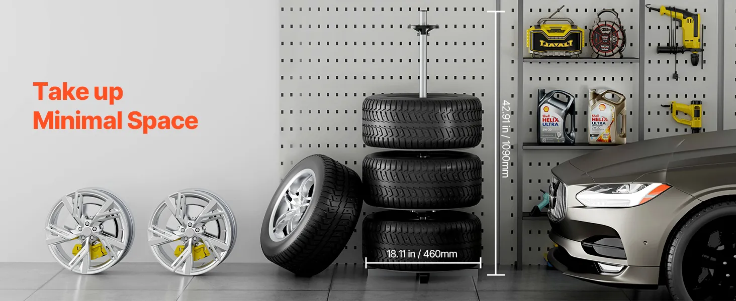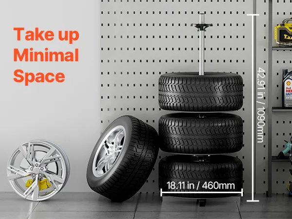 Maximale ruimte-efficiëntie: deze boomvormige bandenstandaard is 460 mm (18,11 inch) breed en 1090 mm (42,91 inch) hoog en maakt gebruik van verticale ruimte zonder veel vloeroppervlak in beslag te nemen, waardoor uw garage, werkplaats wordt opgefleurd of uw huis schoon en netjes blijft .