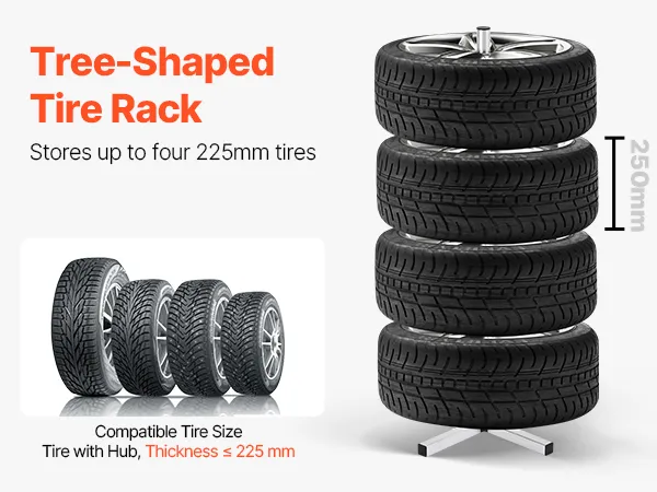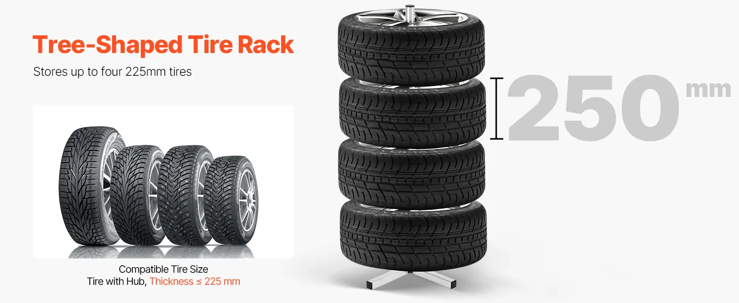 Met zijn ruimtebesparende, boomachtige ontwerp en compacte voetafdruk van 46 x 46 cm optimaliseert dit bandenopslagrek het ruimtegebruik efficiënt en slaat het banden netjes en ruimtebesparend op.