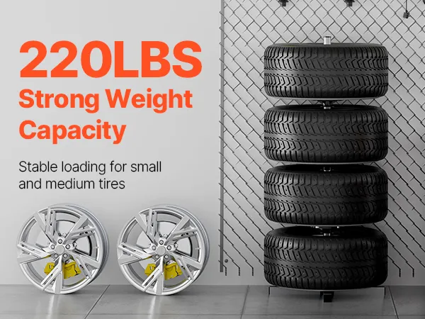 Hoog draagvermogen: met een robuust draagvermogen van maximaal 100 kg (220 lbs) kan deze bandenhouder veilig maximaal 4 banden met velgen (tot 8,86 inch / 225 mm breed) vasthouden, waardoor een betrouwbare opslagoplossing wordt geboden voor het opbergen van uw banden kunnen netjes opgeborgen worden.