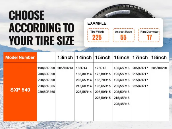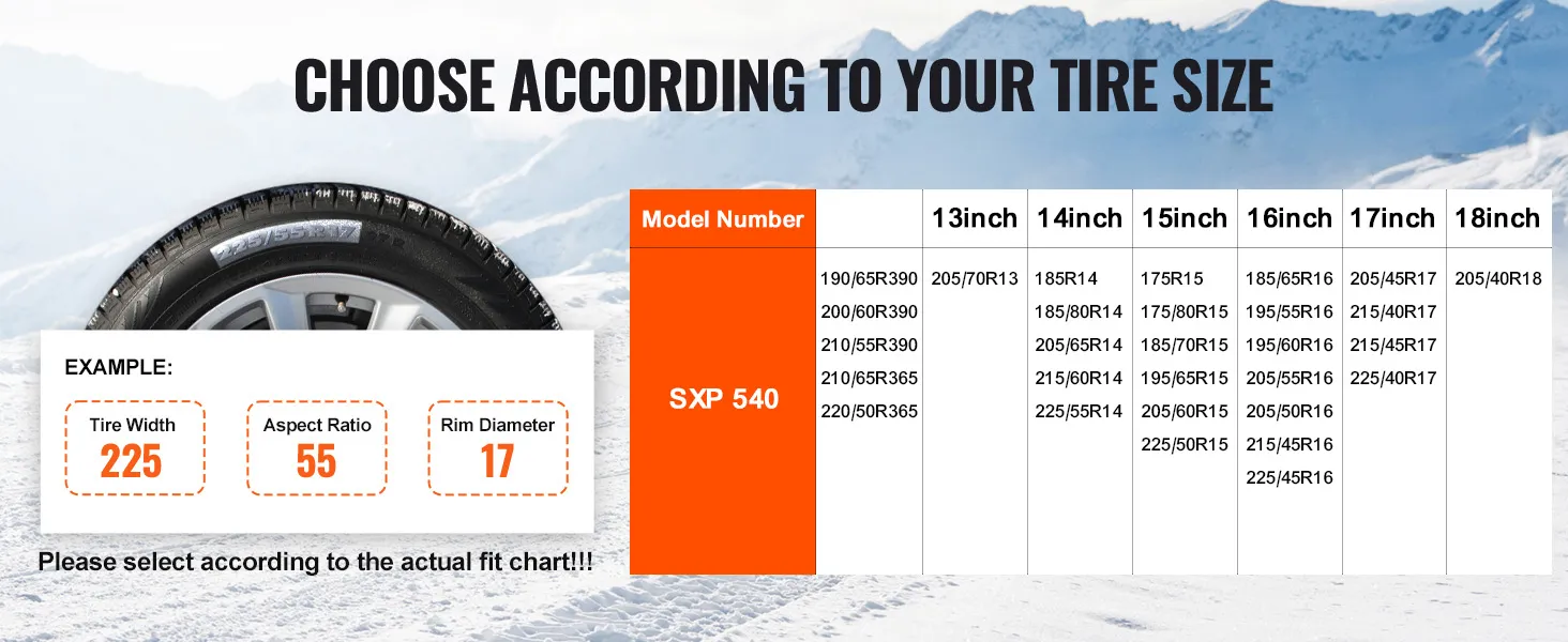 Tire Size Compatibility: These snow chains are compatible with the following tire sizes: 175-15;185-14;185/70-15;190/65-390;195/65-15;195/70-14;200/60-390;205/55-16;205/60-15;205/65-14;205/70-13;210/55-390;210/65-365;220/50-365;225/55-14;215/45-17;205/50-16. Please verify your tire size to ensure compatibility, and install the chains as tightly as possible for optimal performance.