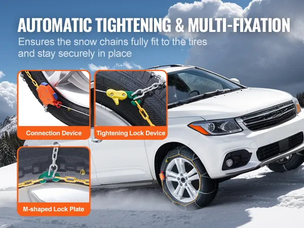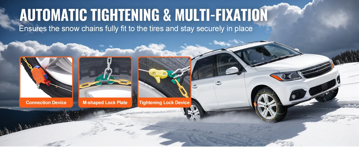 Auto Tightening for a Secure Fit: Equipped with an automatic tightening device for easy adjustment, these chains fit snugly on your tires and are less likely to fall off. Multiple fastening mechanisms simplify installation, eliminating the need for a jack.