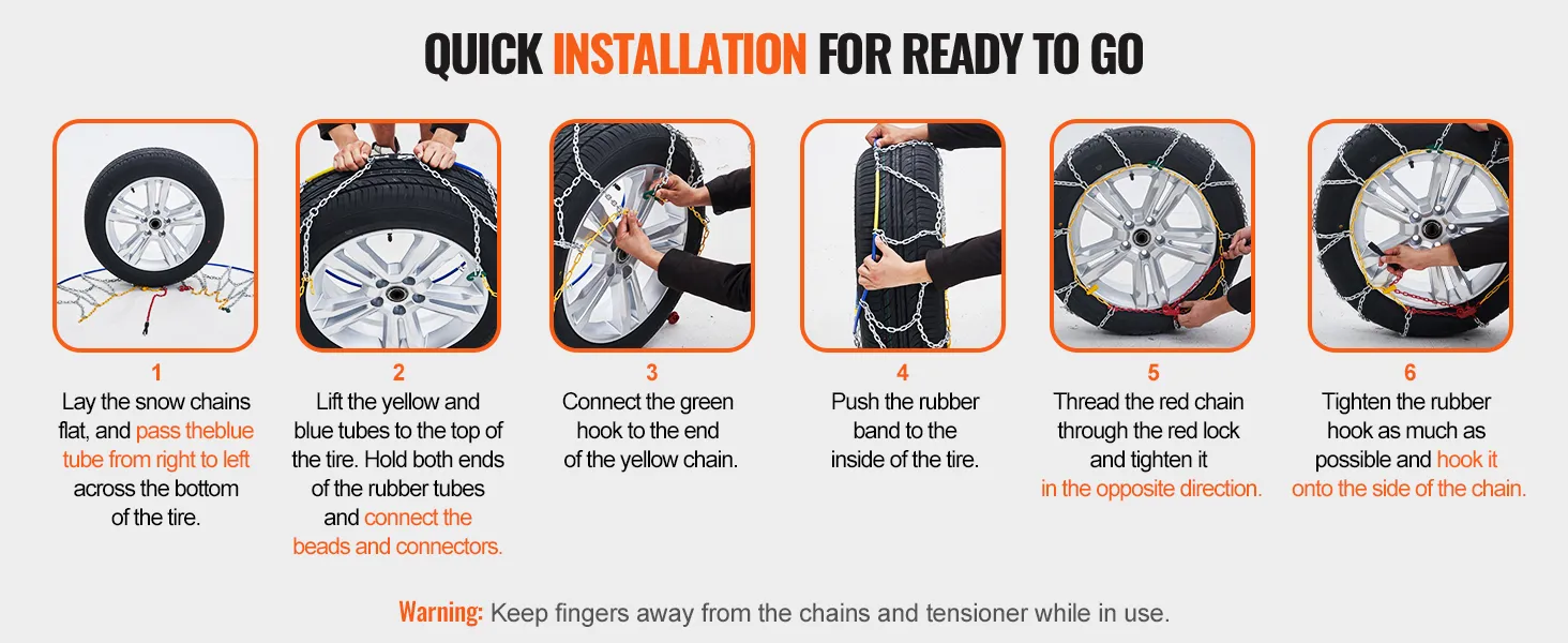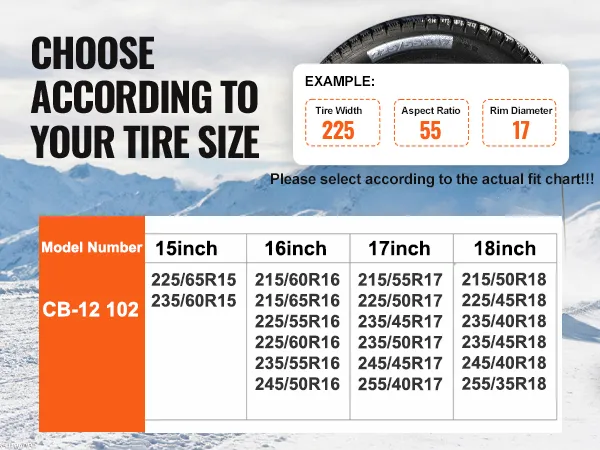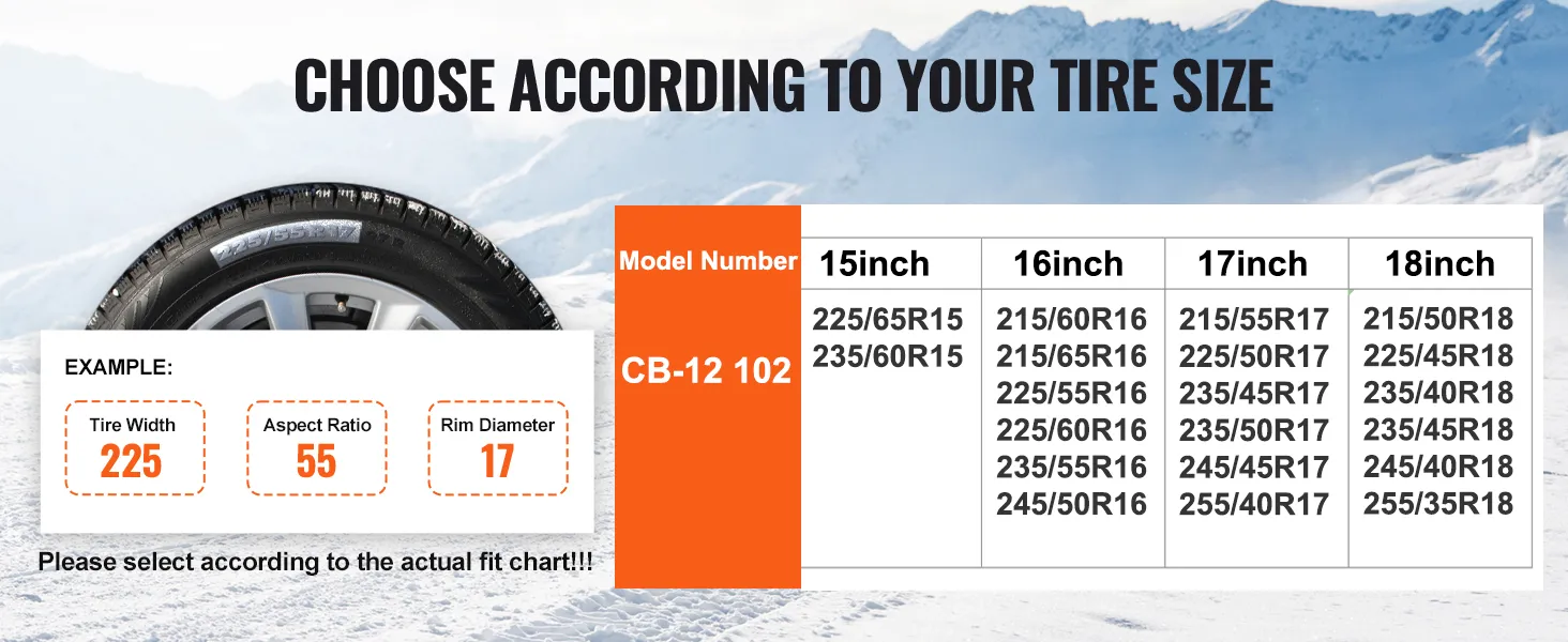 Tire Size Compatibility: These snow chains are compatible with the following tire sizes: 225/60-16;215/60-16;225/65-15;225/55-16;235/55-16;225/50-17;235/40-18;225/55-17;215/55-17. Please verify your tire size to ensure compatibility, and install the chains as tightly as possible for optimal performance.