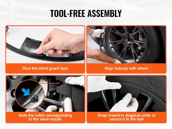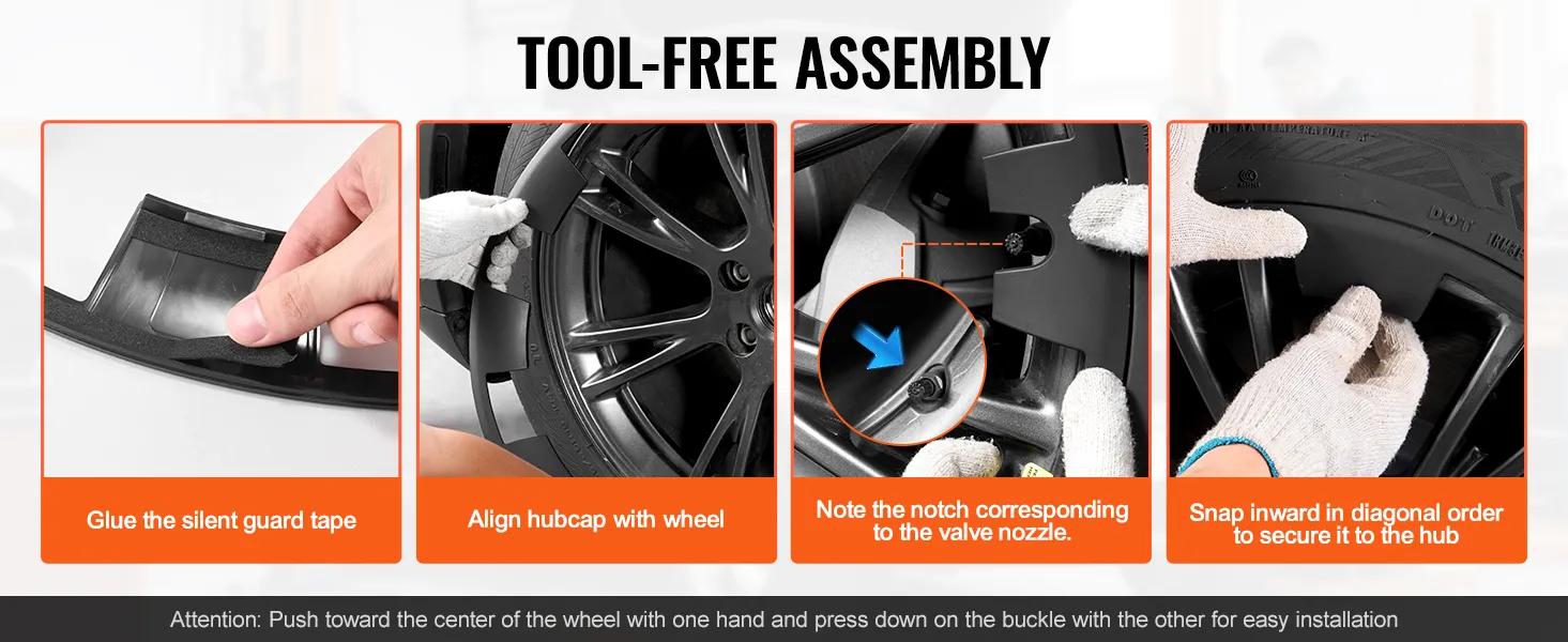 Niet-destructieve installatie: het clipontwerp maakt de installatie sneller en eenvoudiger. Voorbereide luchtmondstukgaten hoeven niet te worden vervangen. Door zachtjes te drukken wordt de wieldop zonder gereedschap stevig aan de wielnaaf bevestigd en valt deze er niet gemakkelijk af bij het rijden op hobbelige wegen.