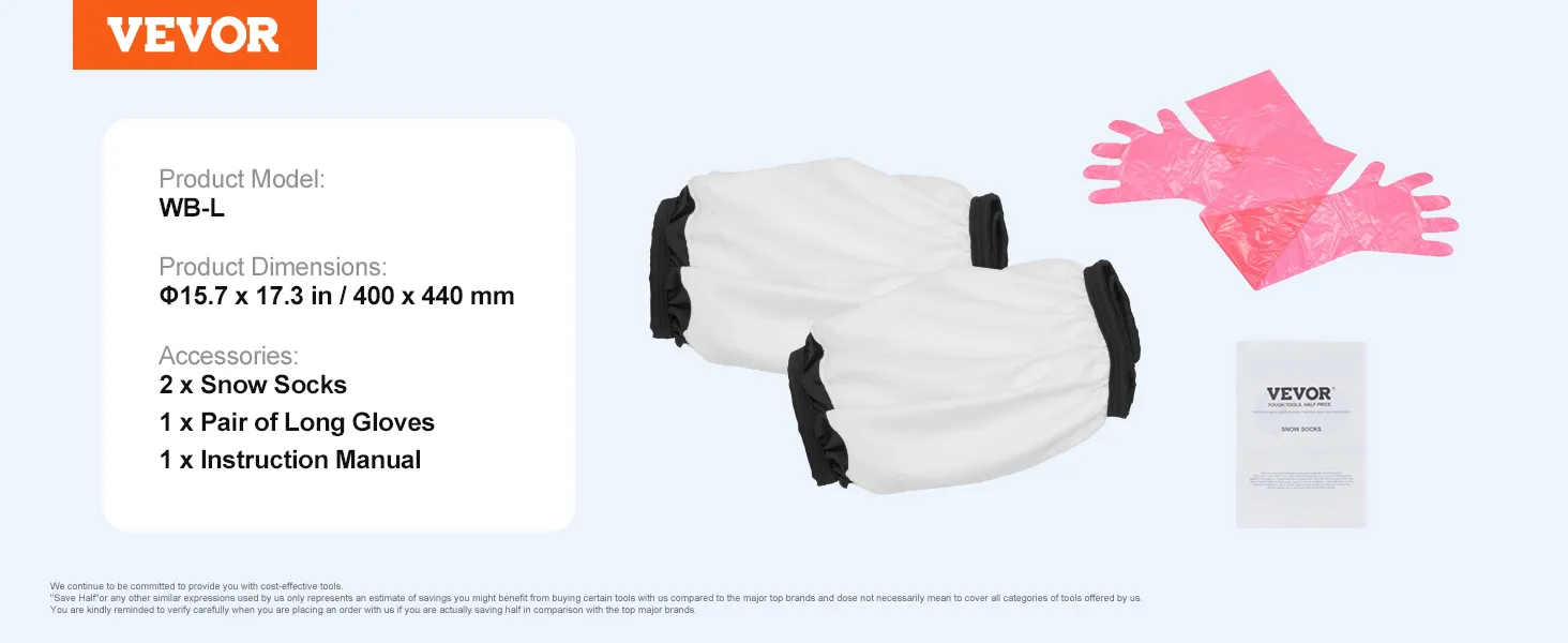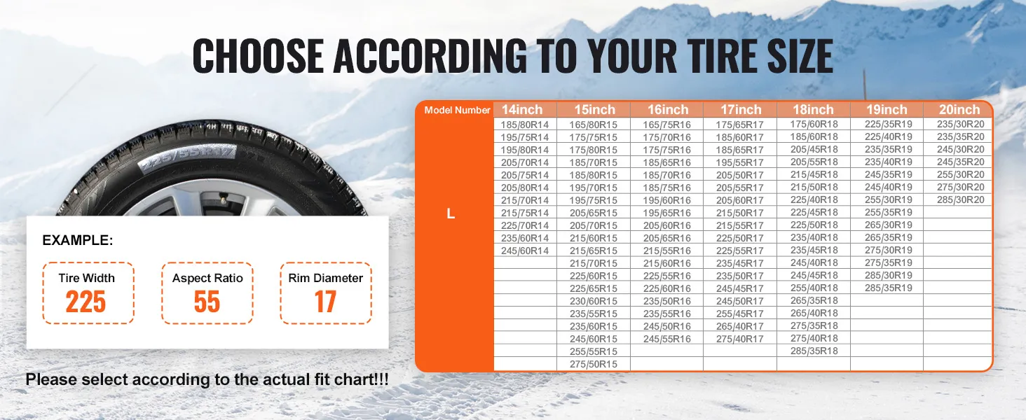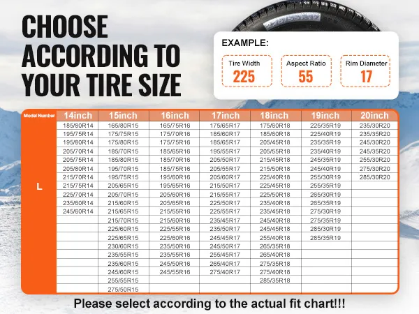 Tire Model Selection:These snow socks are sized at Φ15.7×17.3 in (L Size). Detailed compatible tire models are shown on the page. Please check your tire model carefully to ensure the snow socks fit your tires.
