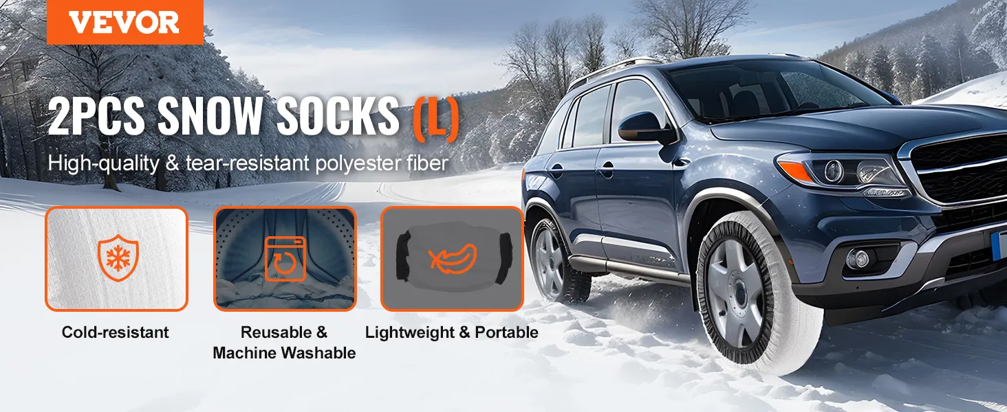 Our snow tire socks fit cars, SUVs, and trucks. Please measure your tire size to select the correct snow socks, and ensure a tight fit for safety and durability.