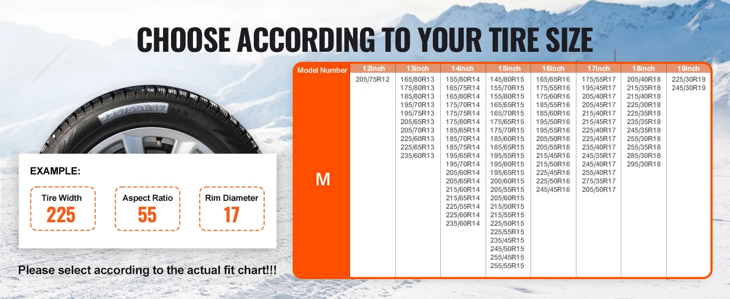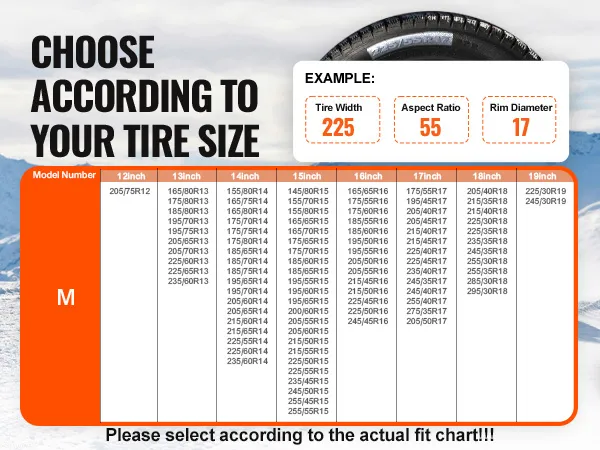 Tire Model Selection:These snow socks are sized at Φ15.2×16.9 in (M Size). Detailed compatible tire models are shown on the page. Please check your tire model carefully to ensure the snow socks fit your tires.