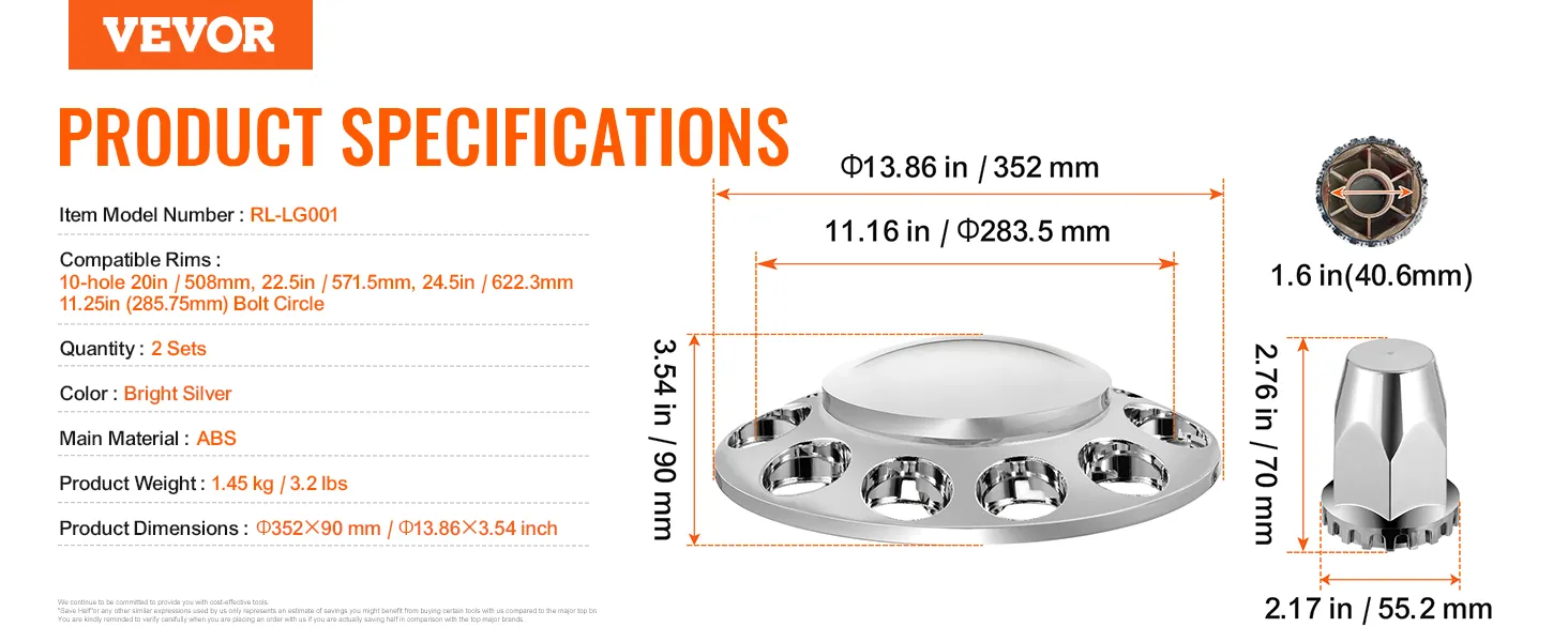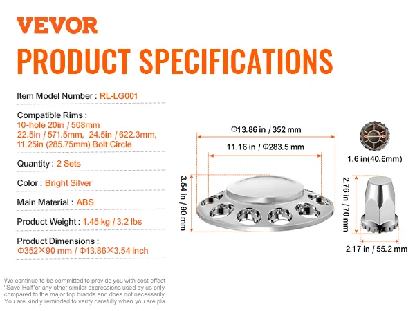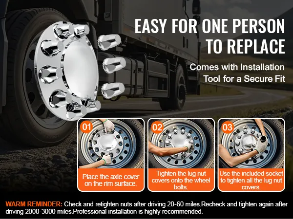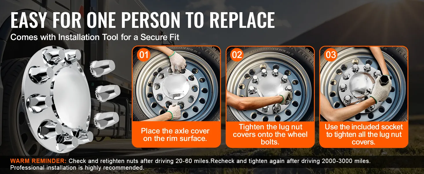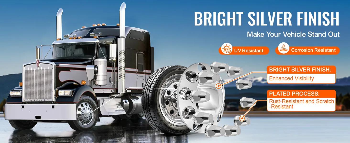 Compatibel met verschillende velgmaten: de complete asafdekkingsset past op verschillende velgmaten, inclusief 10-gaats velgen in de maten 20" (508 mm), 22,5" (571,5 mm) en 24,5" (622,3 mm). Dit zorgt voor een eenvoudige installatie, ongeacht het voertuigtype.
