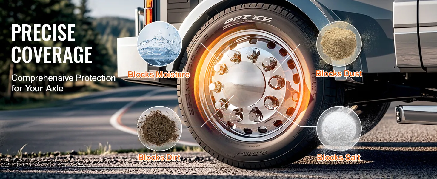 Deze complete set asbescherming biedt uitgebreide bescherming voor uw as en blokkeert effectief vocht, stof, vuil en zout om de levensduur van uw as en wielmoeren te verlengen.
