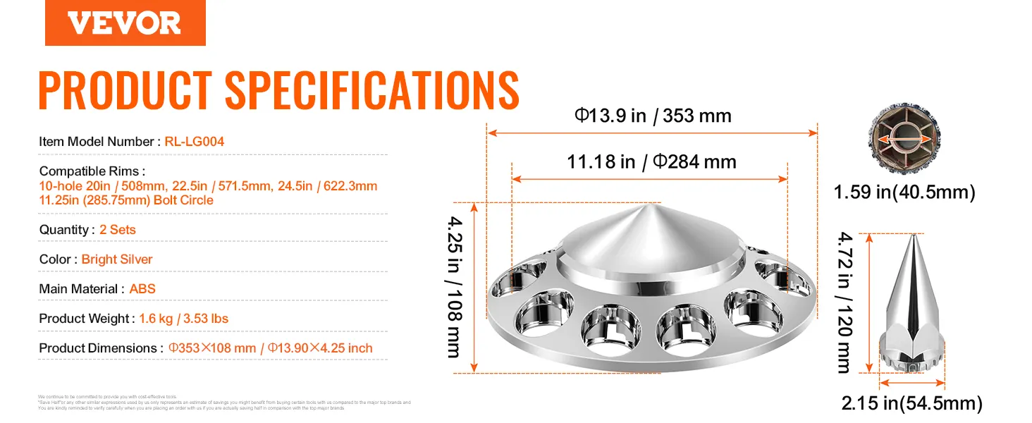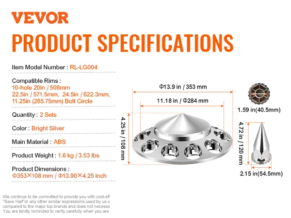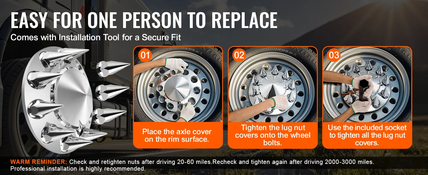 Ongeacht of uw vrachtwagen is uitgerust met velgen van 508 mm, 571,5 mm of 622,3 mm of een boutcirkel van 285,75 mm, deze opleggerasafdekking geeft uw voertuig een persoonlijke uitstraling en zorgt ervoor dat uw vrachtwagen er prachtig uitziet op de weg.