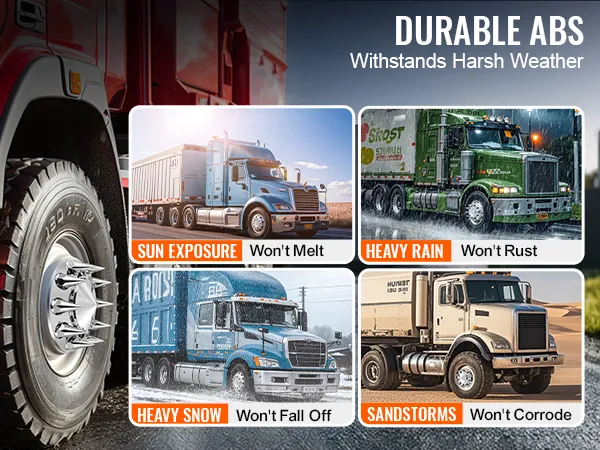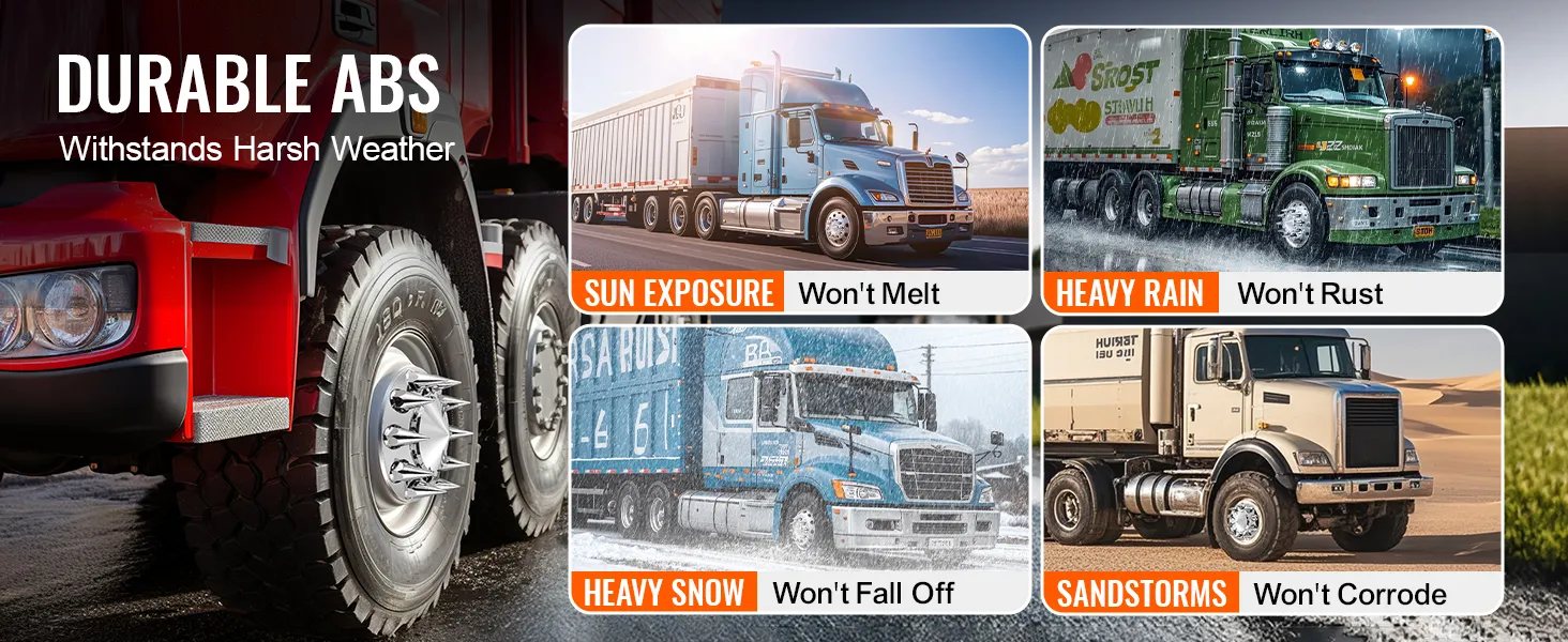 Deze wielmoerdoppen zijn gemaakt van duurzaam ABS-materiaal en blijven intact, zelfs bij extreme weersomstandigheden zoals zonlicht, zware regen, sneeuw en zandstormen. Ze beschermen uw truck betrouwbaar, zelfs onder zware omstandigheden.