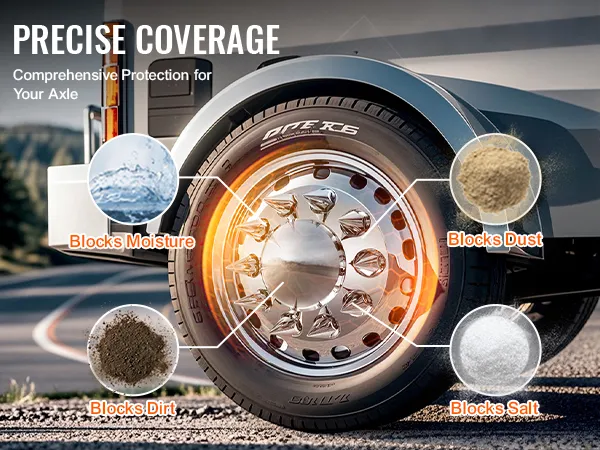 Uitgebreide bescherming: De asafdekkingsset biedt volledige bescherming voor de as en wielmoeren, waardoor wordt voorkomen dat vuil, vocht en andere verontreinigingen kritieke gebieden binnendringen. Dit vermindert corrosie en slijtage en verlengt de levensduur van het voertuig.