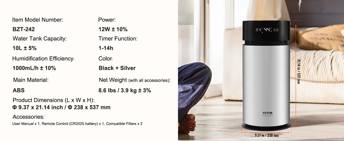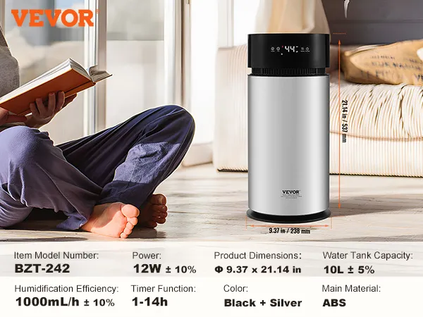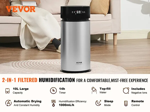 VEVOR Luchtbevochtiger, tot 100 m², 10 L (2,64 g) Luchtreiniger met koele vochtigheid, 3 snelheden en timer van 1-14 uur, premiumfilter, stille slaapmodus voor de slaapkamer