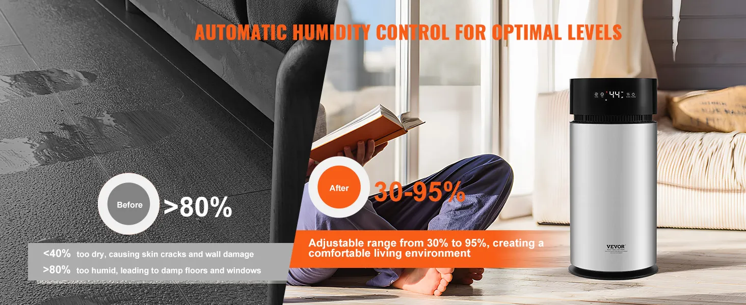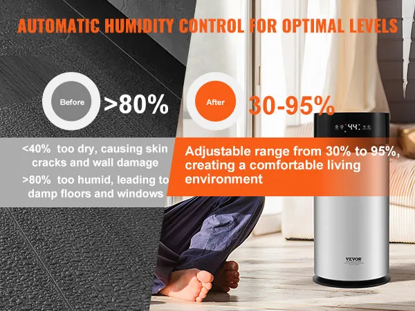 Eenvoudig in gebruik: regel eenvoudig de luchtvochtigheid via aanraking of afstandsbediening. De intuïtieve interface biedt drie vochtigheidsinstellingen (hoog-gemiddeld-laag), een timerfunctie (1-14 uur) en automatische vochtigheidsregeling van 30% tot 95% om aan verschillende behoeften te voldoen.
