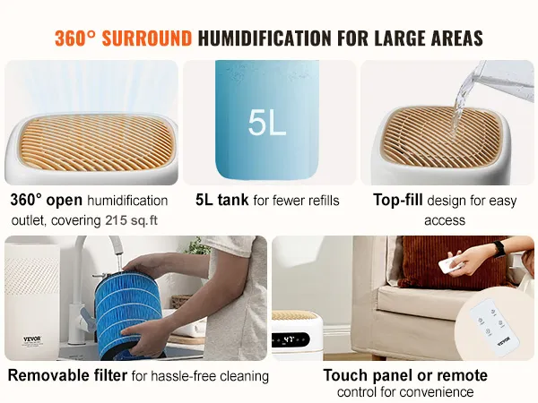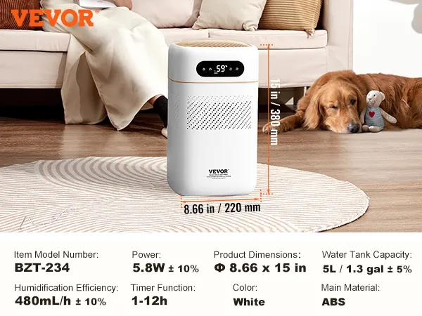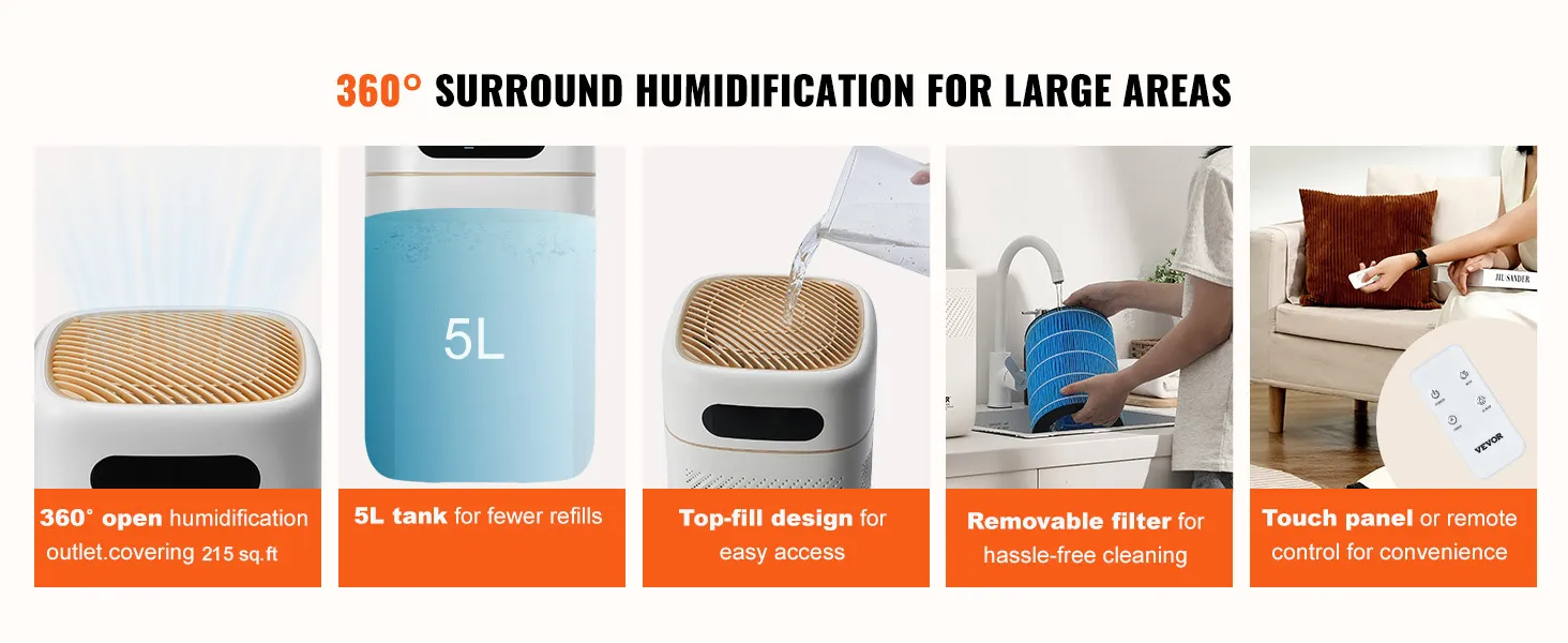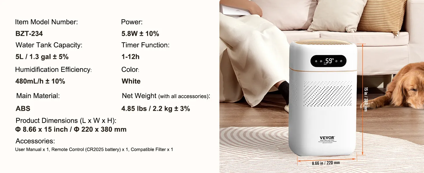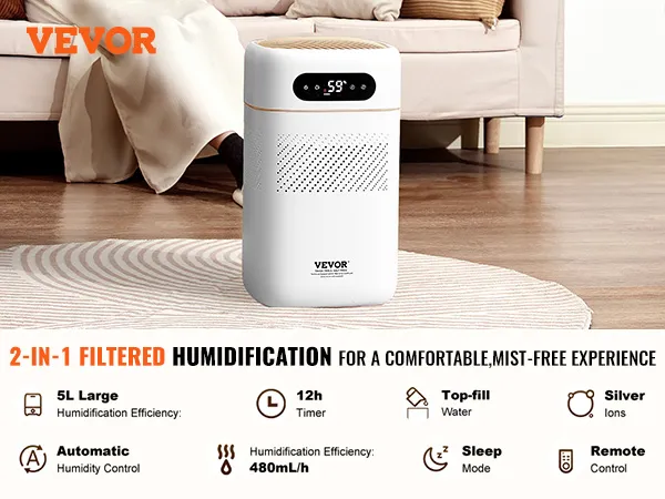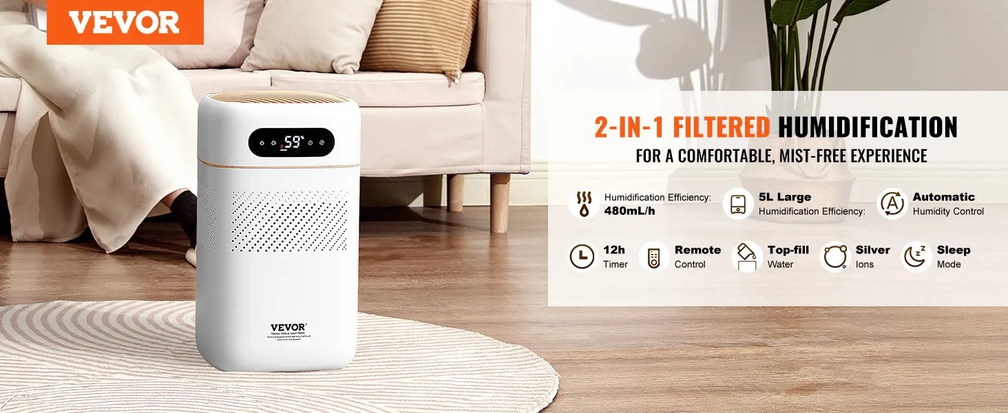 VEVOR Luchtbevochtiger, tot 50 m², 480 ml/u Slimme, koele, vochtige luchtreiniger, 3 snelheden en timer van 1-12 uur, premiumfilter, stille slaapmodus voor de slaapkamer, 5 l (1,32 gallons)