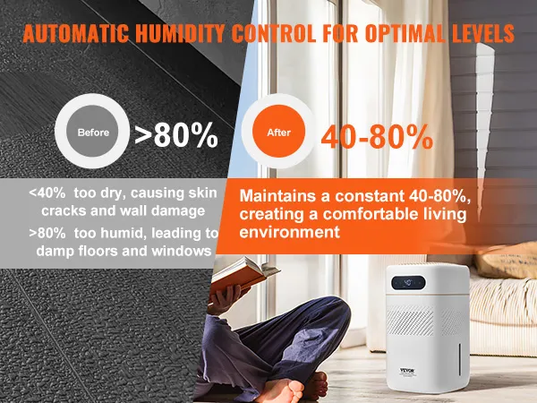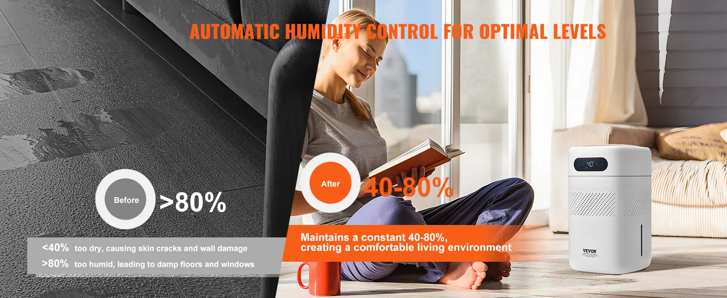 Eenvoudig in gebruik: regel eenvoudig de luchtvochtigheid via aanraking of afstandsbediening. De intuïtieve interface biedt drie vochtigheidsinstellingen (hoog-medium-laag), een timerfunctie (1-12 uur) en automatische vochtigheidsregeling tussen 40% en 80% om aan verschillende behoeften te voldoen.