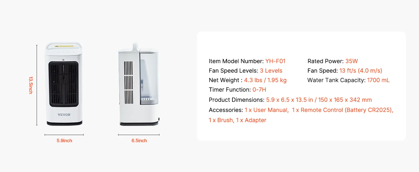 Large Water Tank: Featuring a 1700ml top-fill water tank, this portable air cooler makes it easy to add water, ice cubes, or ice crystals. A full tank provides hours of refreshing cooling, reducing the need for frequent refills and ensuring continuous comfort.