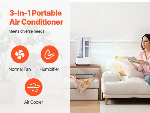 This portable air conditioner combines four essential functions—normal fan, humidification, cooling, and ambient lighting. Whether you're looking for a refreshing breeze on a hot summer day or extra humidity in dry seasons, it easily adapts to meet all your summer needs.