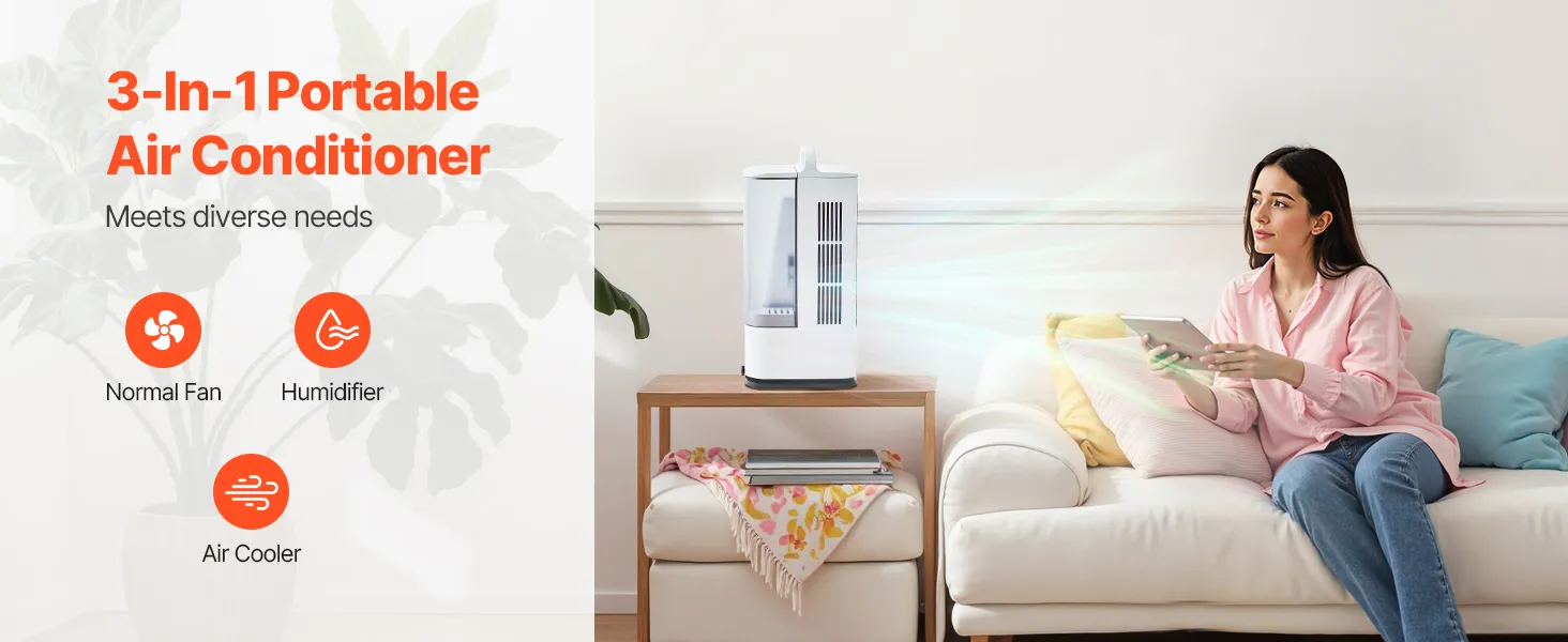 4-in-1 Air Cooler: This portable air conditioner fan combines cooling, humidifying, air circulation, and ambient lighting. Ultrasonic mist technology quickly cools the air, while the colorful lighting enhances the summer vibe.