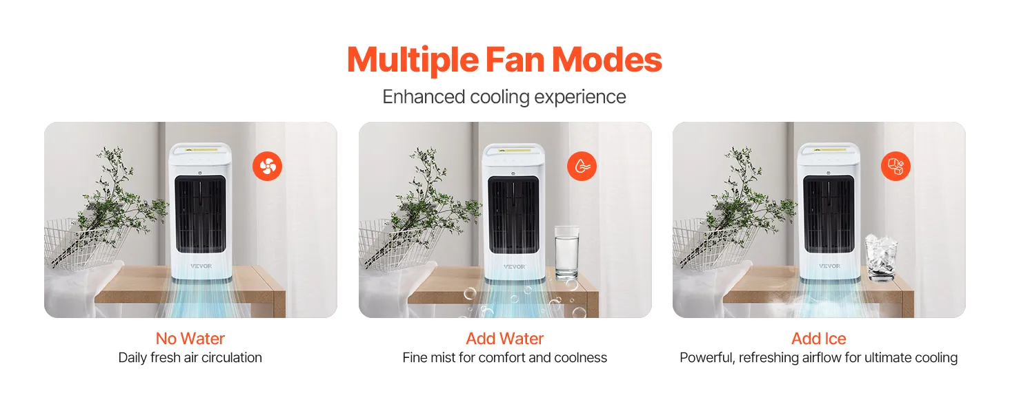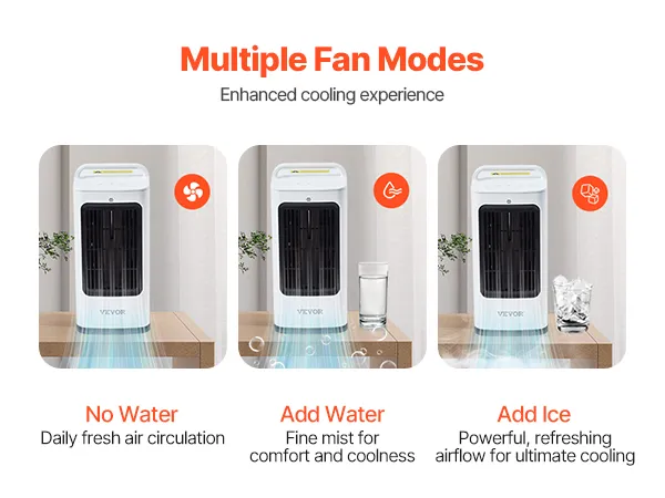 The evaporative air cooler offers multiple modes: no water, add water or ice, which you can adjust based on your needs. Whether it's for basic ventilation, adding humidity to dry air, or powerful cooling on hot days, this cooler provides the perfect solution.
