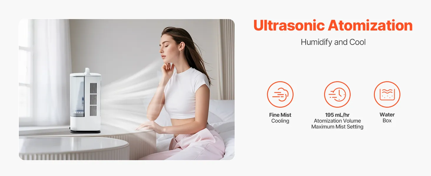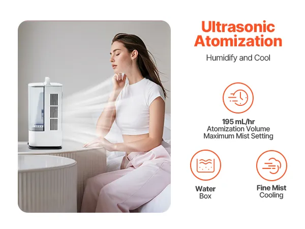 This personal air conditioner uses ultrasonic mist technology to evenly disperse water into fine mist, boosting humidity and helping with dry skin. It’s ideal for improving air quality and fighting dryness, making it an ideal choice for a more comfortable living space.