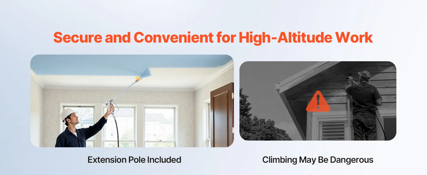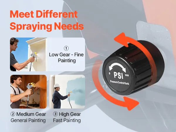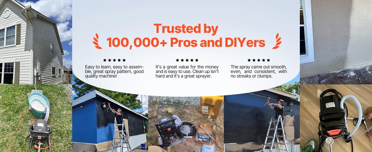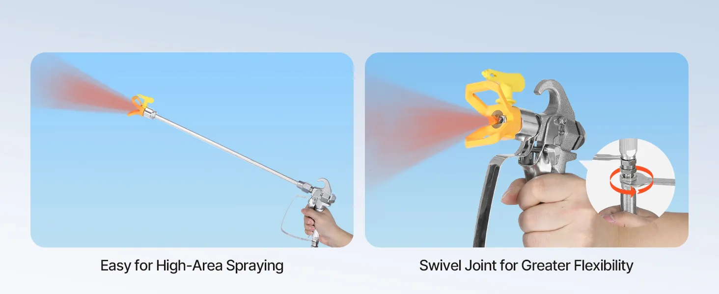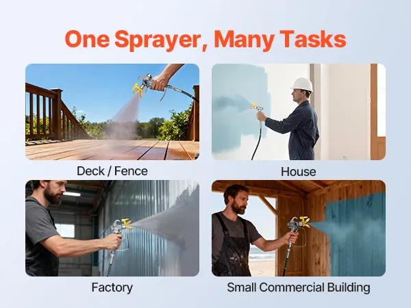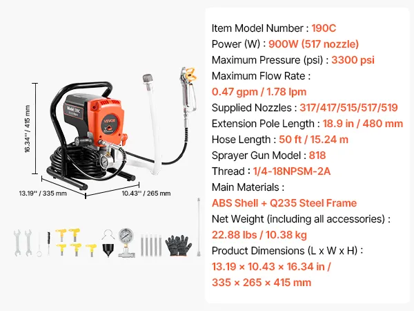 Optimale lakresultaten: De hoogwaardige sproeier zorgt voor nauwkeurige controle en minimaliseert overspray. Ons airless verfspuitsysteem is voorzien van een filter en afdichtingen om verstoppingen en lekkages te voorkomen, waardoor een gelijkmatige dekking gegarandeerd is.