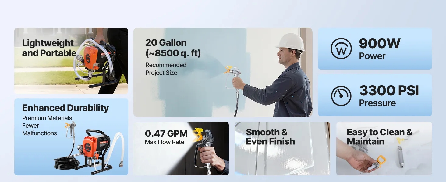 VEVOR Airless Verfspuit 900 W 3300 psi, 1,78 L/min Verfspuitsysteem met Reinigingsborstel, Slang, Verlengstuk en Spuitmonden, Verfspuit voor Woningen en Gebouwen