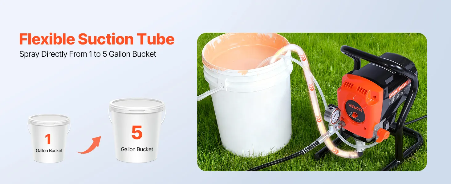 Praktisch ontwerp: De lichtgewicht airless spuitmachine maakt moeiteloze beweging mogelijk, terwijl de steel hoge en lage oppervlakken bereikt, waardoor klimmen of bukken niet nodig is. De flexibele zuigslang zuigt verf aan uit emmers van 1 tot 5 gallon (ca. 3,8 tot 19 liter), waardoor veelzijdige toepassingen mogelijk zijn.