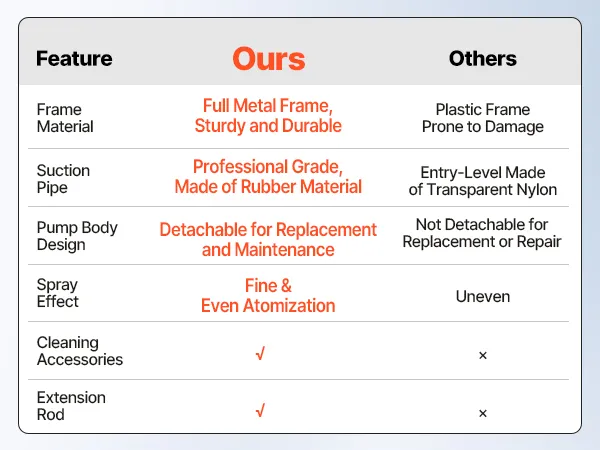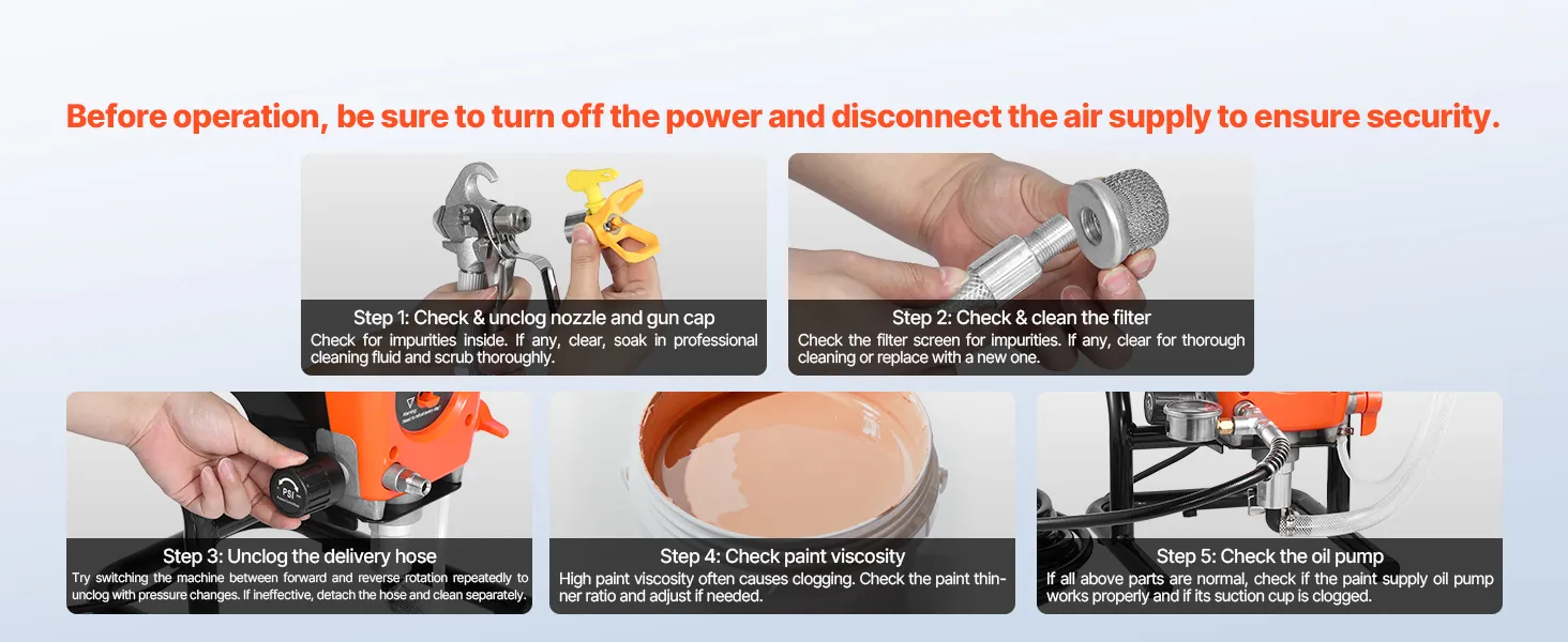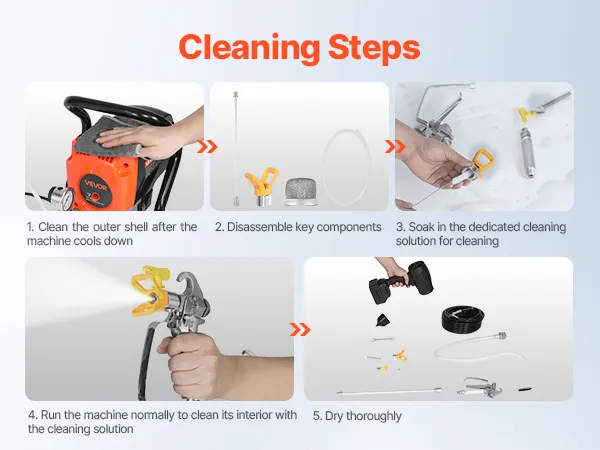 Eenvoudig reinigen en onderhouden: De verfspuit is voorzien van een reinigingsborstel voor gemakkelijk onderhoud. Een afneembare pompbehuizing en accessoires vereenvoudigen vervanging en onderhoud, waardoor de apparatuur in topconditie blijft.