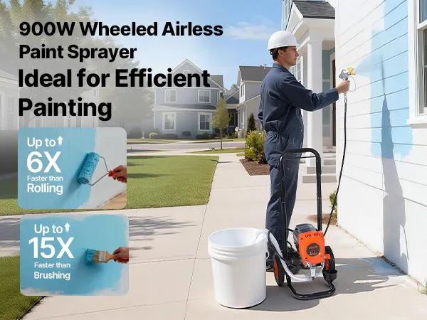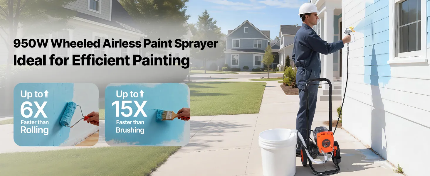 Efficient Coating: The 900W motor, 0.47 GPM flow, and 3300 PSI pressure deliver spraying speeds 6x faster than rollers and 15x faster than brushes. Our stand airless paint sprayer is ideal for large-scale projects like townhouses and factory buildings