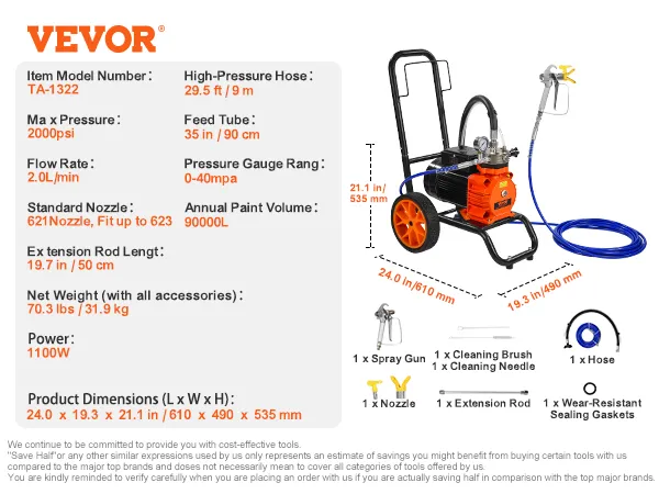 Hoog rendement spuiten: Uitgerust met een krachtige motor van 1100 W, levert het airless spuitapparaat met trolley een druk tot 2000 psi en bedekt snel grote oppervlakken. Met een maximale afgiftesnelheid van 2,0 l/min zorgt het voor een continue en gelijkmatige verftoepassing, waardoor het 5 keer sneller gaat dan rollen en 12 keer sneller dan borstelen - perfect voor middelgrote tot grote spuitklussen.