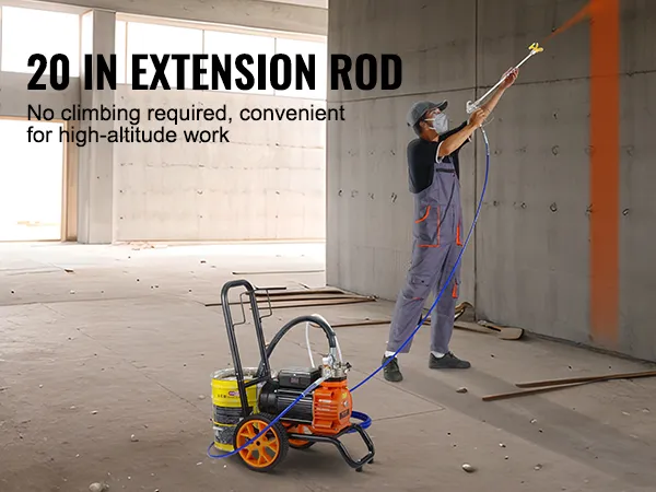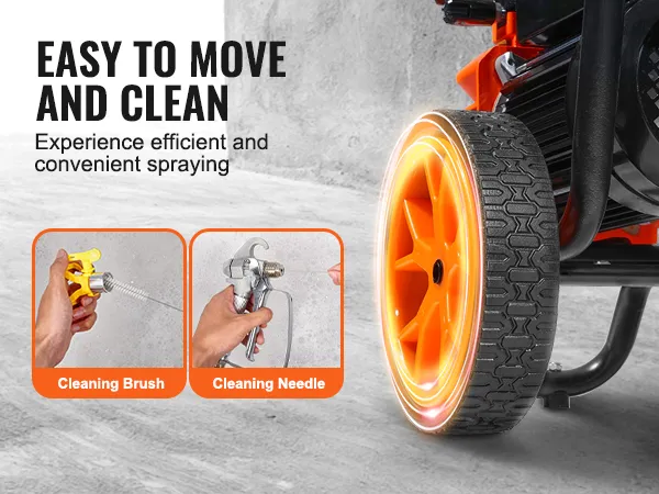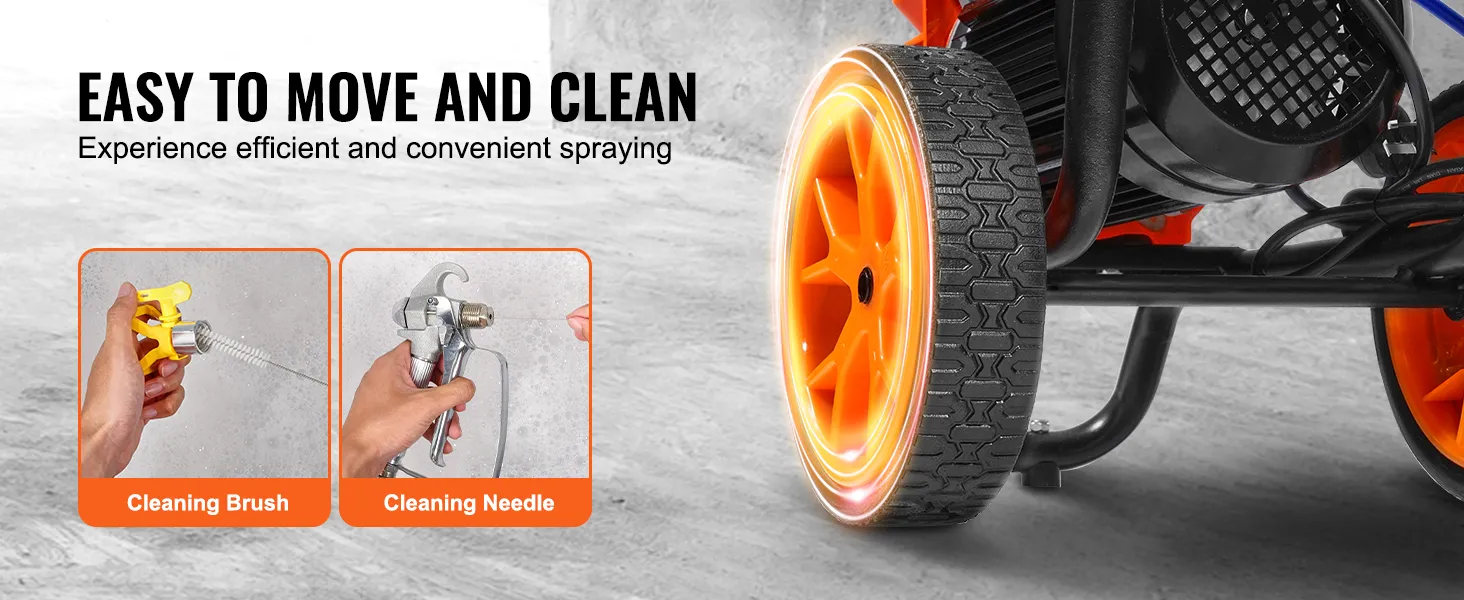 Gemakkelijke mobiliteit: dit airless verfspuitapparaat is uitgerust met wielen en kan zonder veel moeite gemakkelijk naar verschillende werkplekken worden verplaatst. Het is ideaal voor grote of vaak veranderende werkomgevingen. Het comfortabele handvat vermindert tekenen van vermoeidheid.