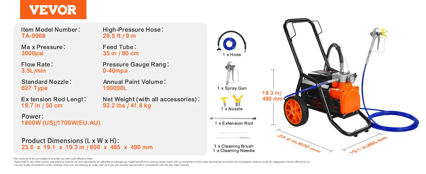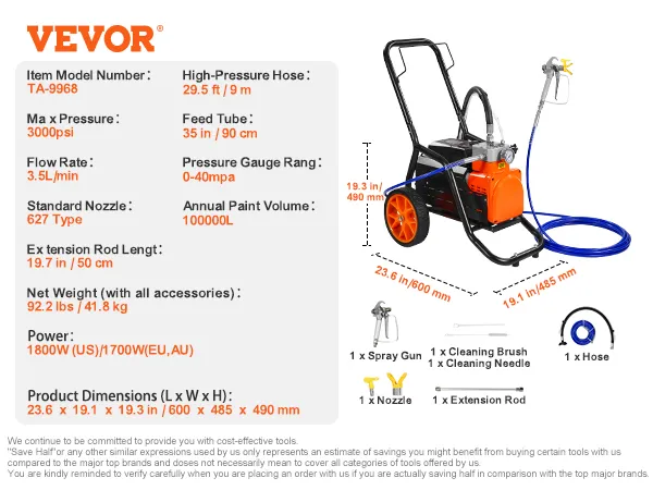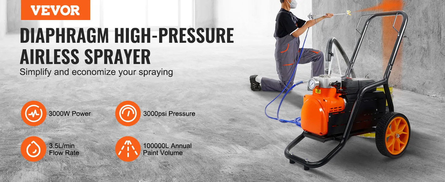 Hoog rendement spuiten: Uitgerust met een krachtige motor van 1700 W, produceert het airless spuitapparaat met trolley een druk tot 3000 psi en bedekt snel grote oppervlakken. Met een maximaal debiet van 3,5 l/min zorgt het voor een continue en gelijkmatige applicatie, waardoor het 5 keer sneller gaat dan rollen en 12 keer sneller dan borstelen - perfect voor middelgrote tot grote spuitklussen.