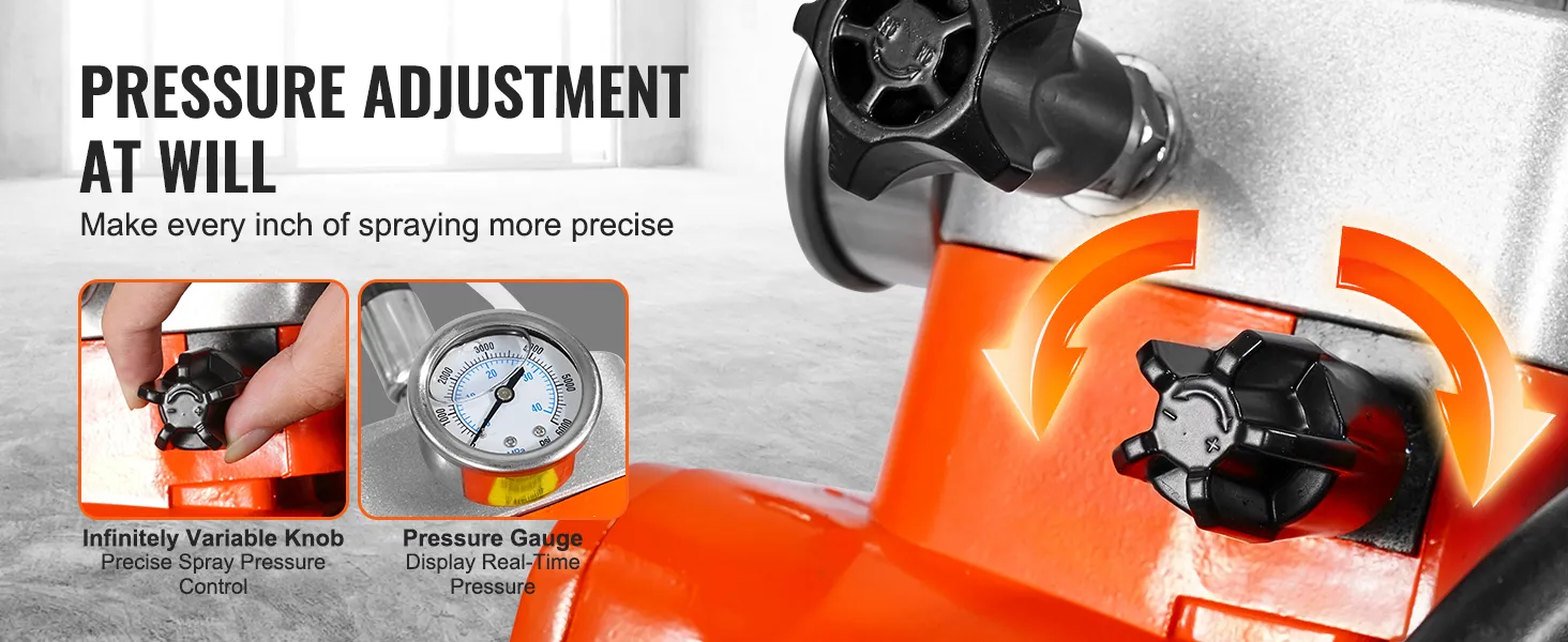 Traploze snelheidsregeling: Pas de snelheid van de elektrische airless verfspuit aan, afhankelijk van verschillende spuitsituaties, materiaalsoorten en laagdiktevereisten. Gebruik voor grote oppervlakken lagere snelheden om het verfverbruik te verminderen.