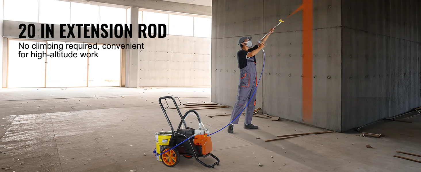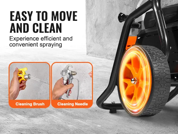Gemakkelijke mobiliteit: dit airless verfspuitapparaat is uitgerust met wielen en kan zonder veel moeite gemakkelijk naar verschillende werkplekken worden verplaatst. Het is ideaal voor grote of vaak veranderende werkomgevingen. Het comfortabele handvat vermindert tekenen van vermoeidheid.