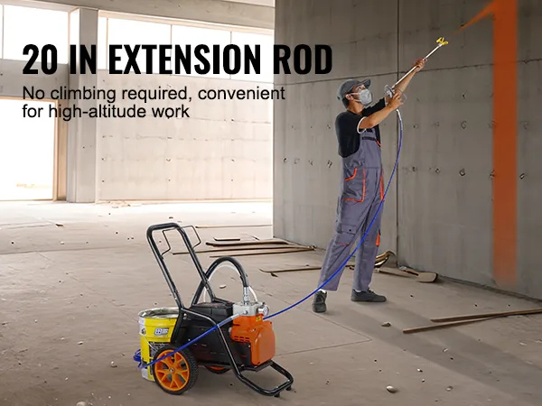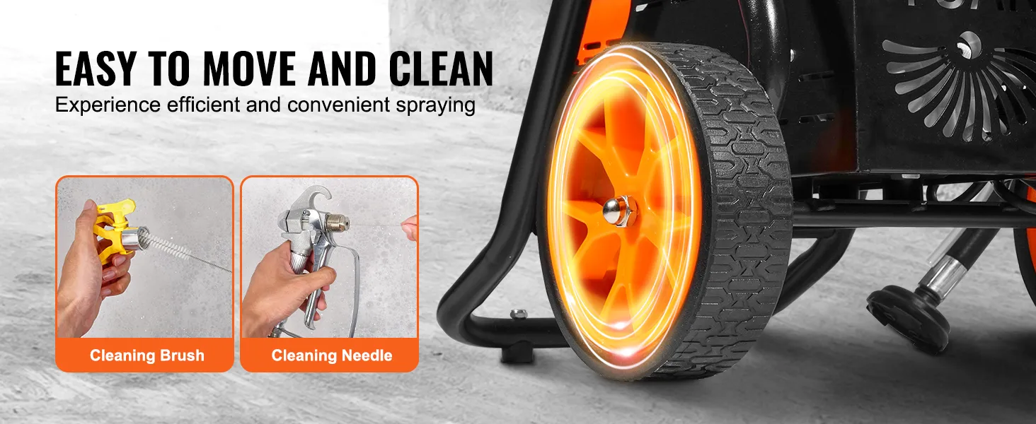 Het mobiele ontwerp maakt het mogelijk om de elektrische airless verfspuit naar de gewenste locatie te verplaatsen zonder deze op te tillen. Deze functie is vooral nuttig in grote of vaak veranderende werkomgevingen.