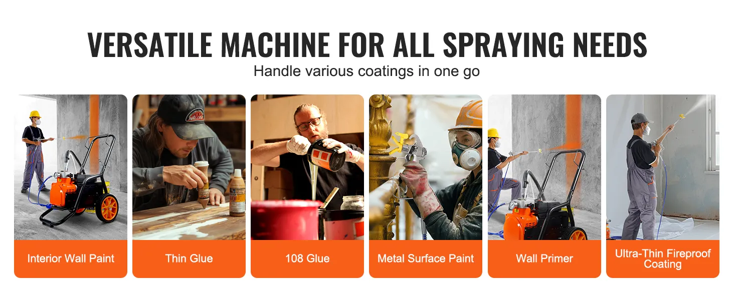 Onze airless verfspuit is bijzonder geschikt voor het spuiten van oppervlakken zoals muren, plafonds en meubels. Het realiseert moeiteloos efficiënte, uniforme en hoogwaardige coatings op grote oppervlakken.
