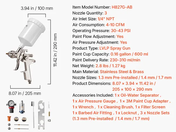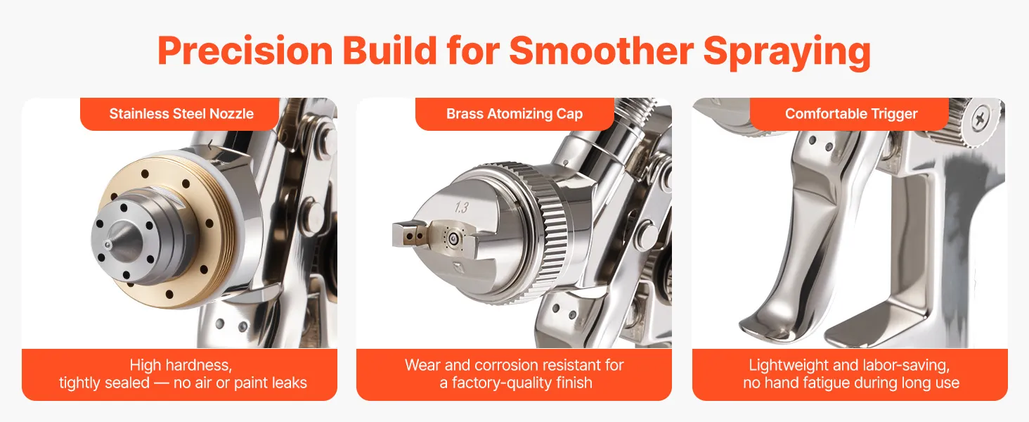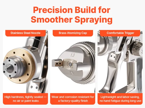 De duurzame roestvrijstalen spuitmonden en messing verstuiverdop voorkomen lekkage van lucht en verf. De gevoelige trekker en ergonomische handgreep verminderen handvermoeidheid en zorgen voor een nauwkeurigere spuitcontrole.